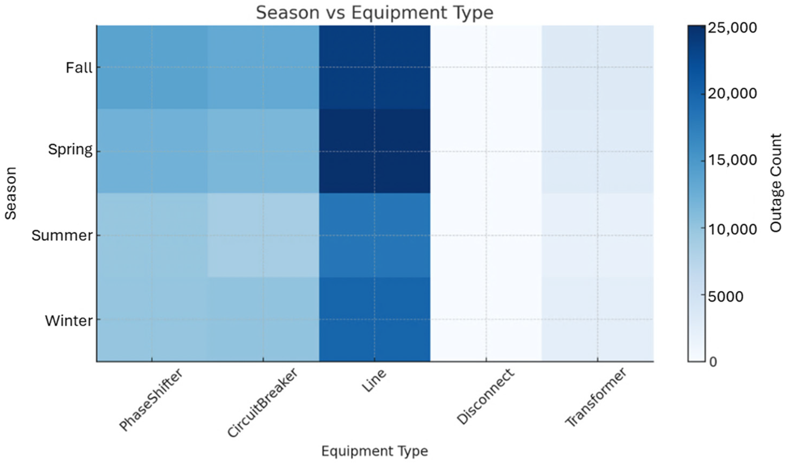 Figure 8. Spring and Fall exhibit the highest number of outages, driven by transitional weather patterns such as storms, high winds, and vegetation growth. These conditions place significant stress on transmission lines and other exposed electrical components, including circuit breakers and phase shifters. In the spring, vegetation growth intensifies, leading to branches potentially encroaching on power lines and increasing the likelihood of service disruptions. Thunderstorms become more frequent, bringing lightning strikes that can damage critical components of the grid. High winds and heavy precipitation further increase outage risks, affecting urban and rural areas.