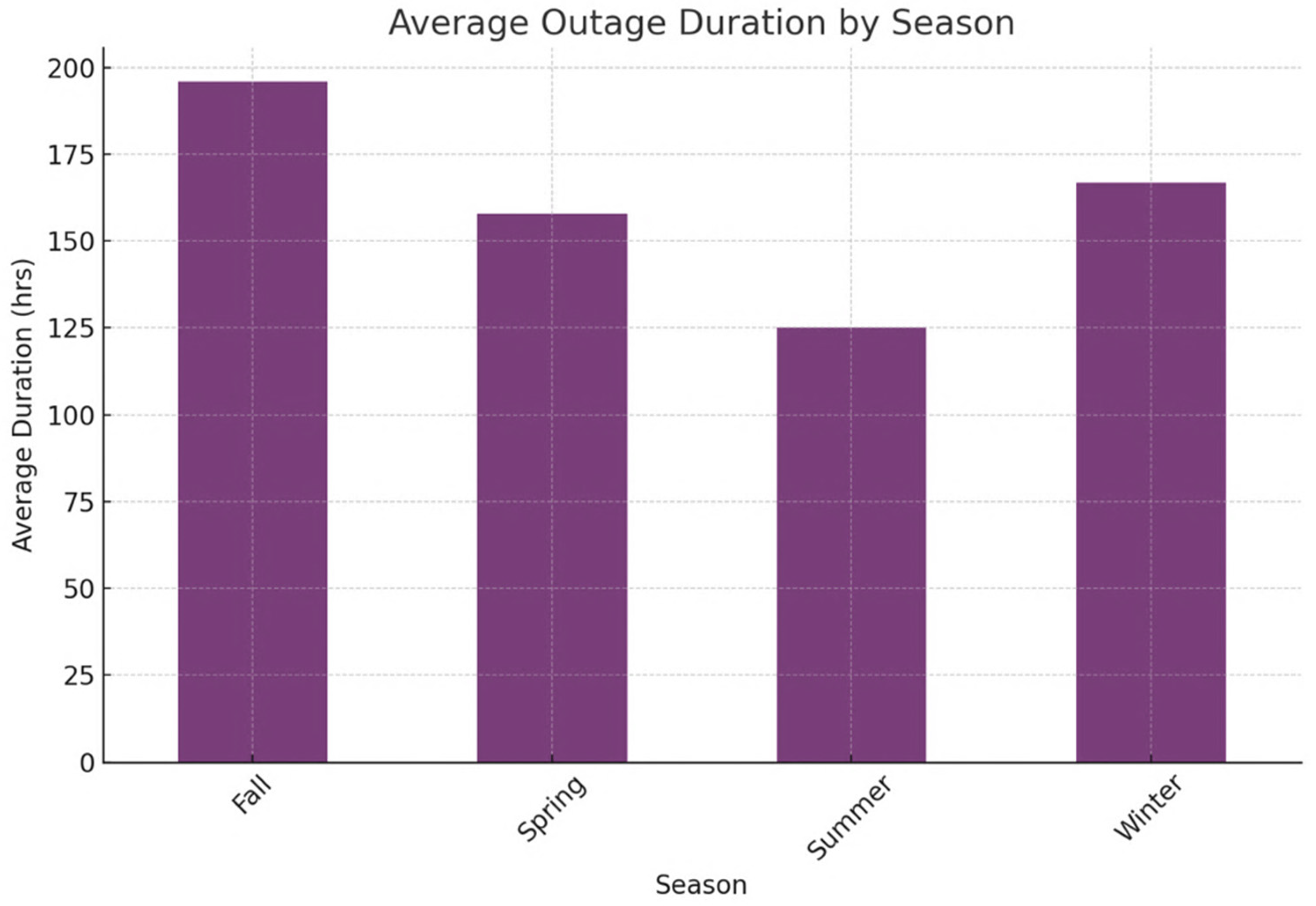 In contrast, summer outages have the shortest average duration, typically around 125 h. While high temperatures and increased electricity demand contribute to grid strain, repair and accessibility challenges are generally less severe than winter conditions. Rapid response times, favorable weather for fieldwork, and fewer environmental obstacles enable quicker resolution of summer outages. However, extreme heat waves and storms still pose reliability risks, highlighting the importance of season-specific outage mitigation strategies [