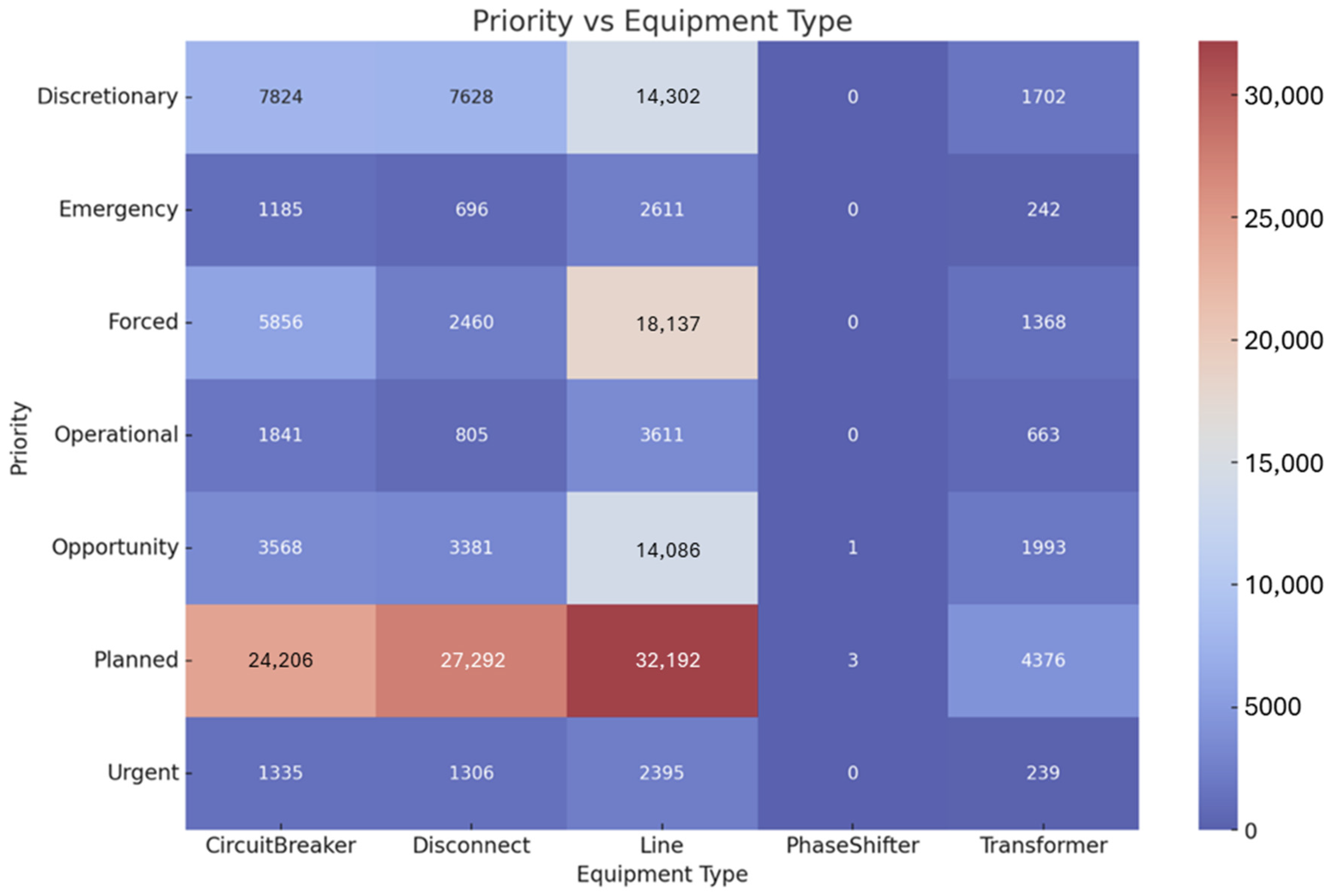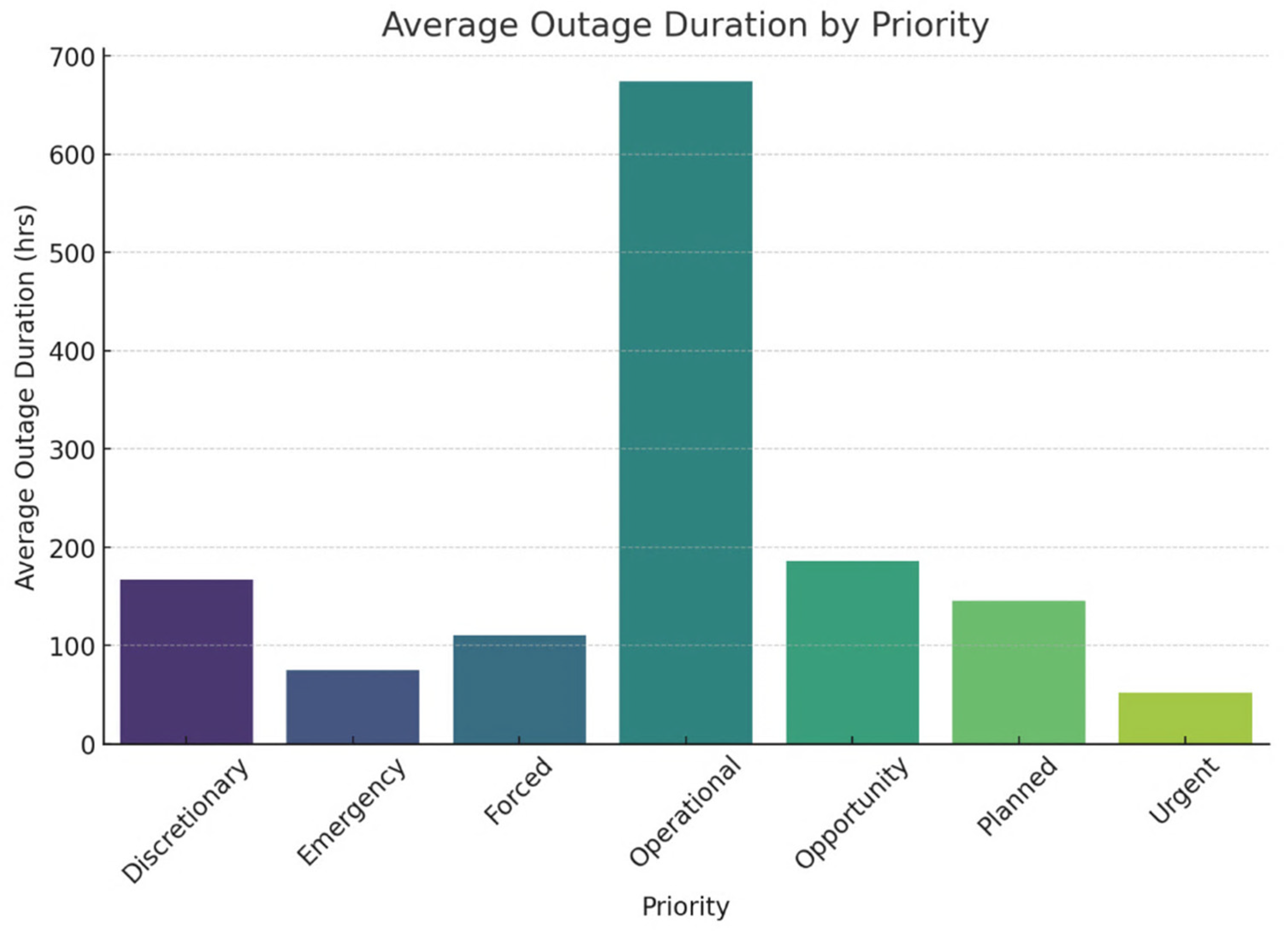 The frequency of outages across priority categories sheds light on operational practices and highlights areas for improvement in outage management strategies. The seven prioritization categories, Discretionary, Emergency, Forced, Operational, Opportunity, Planned, and Urgent, classify outages based on severity, response requirements, and system impact.