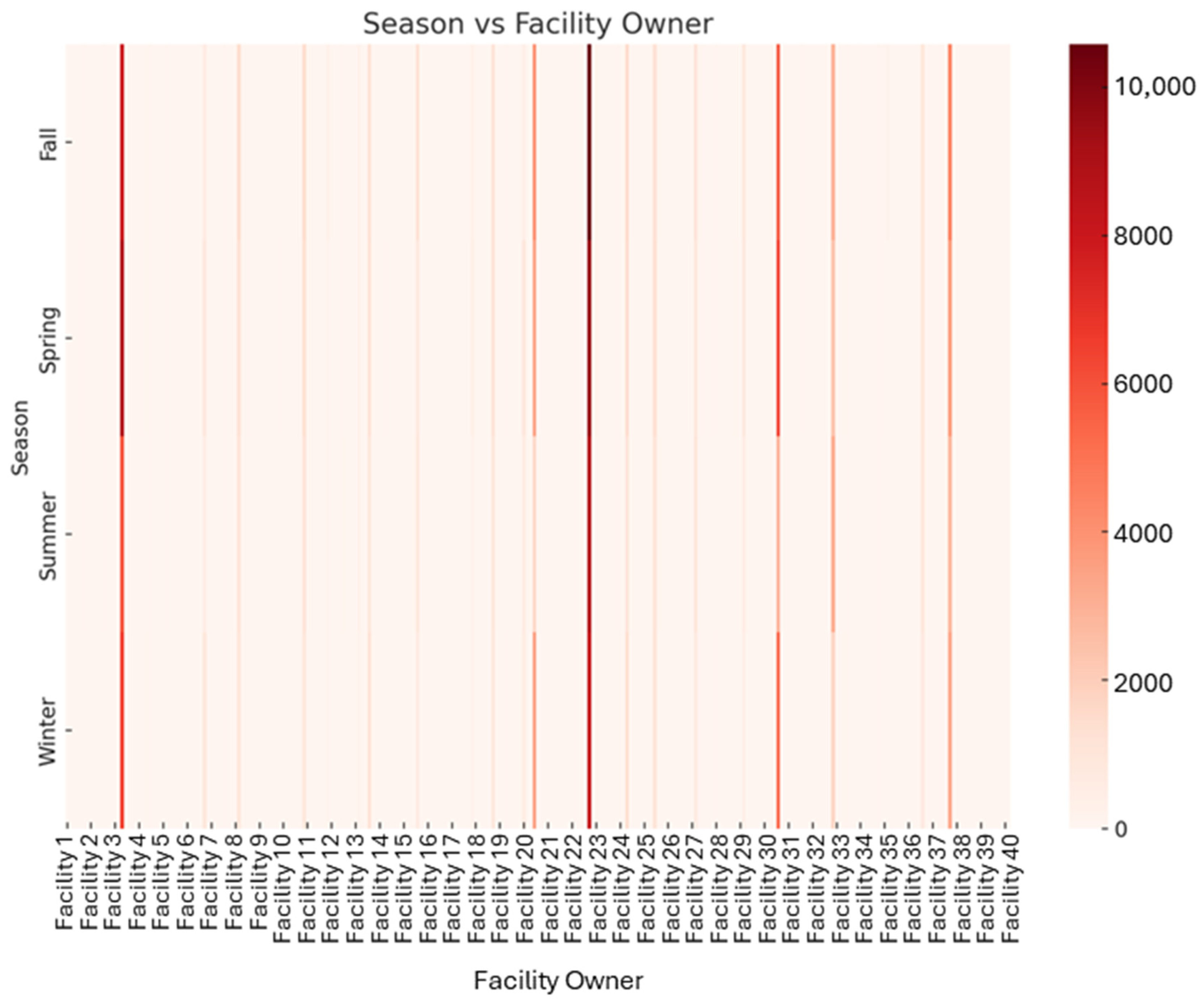 The interaction between facility owners and seasonal outage patterns reveals concentrated vulnerabilities in specific facilities during high-risk seasons.
