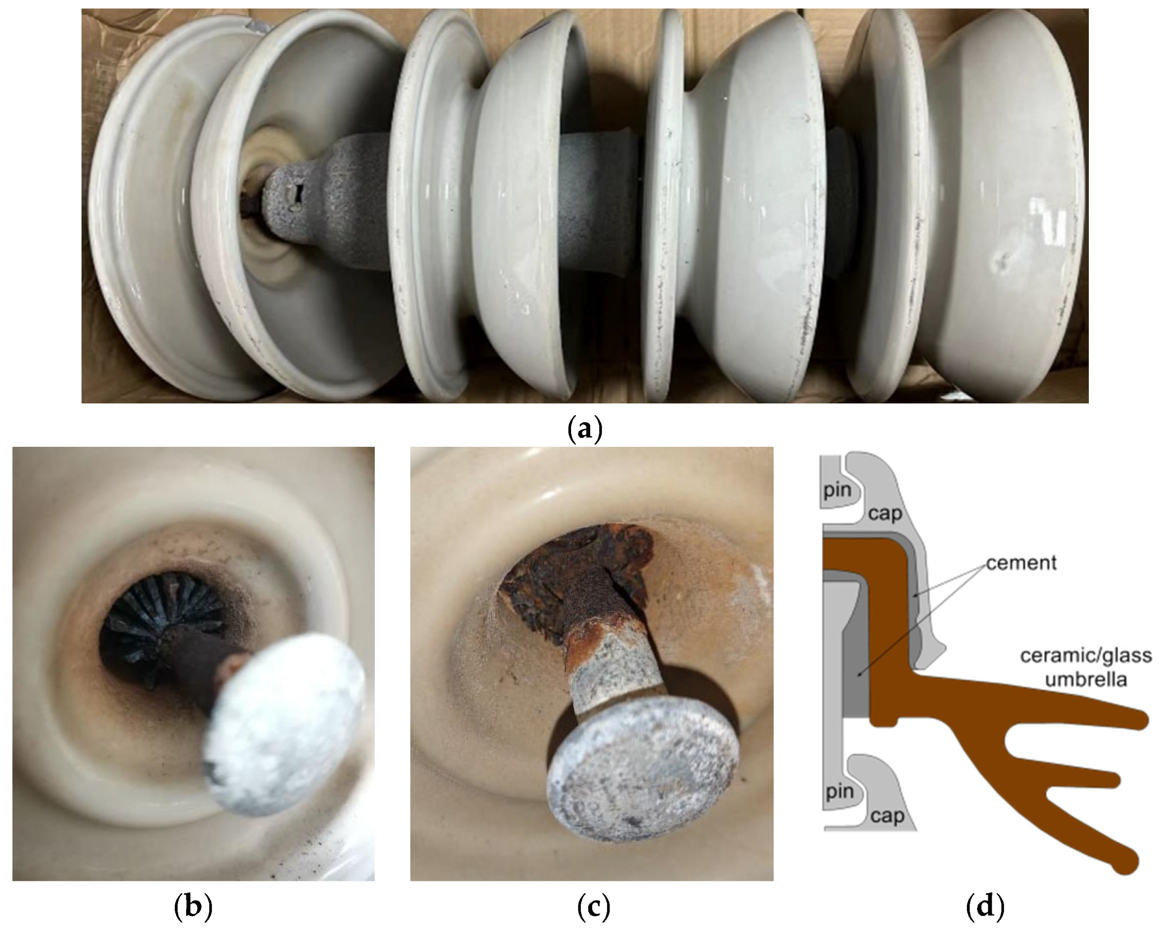 - Luo, L.; Wang, L.; Guan, Z.; Zhang, F.; Li, L. Influence of Pin Corrosion on Mechanical Characteristic of UHVDC Disc Suspension Insulators and Solutions. IEEE Trans. Dielect. Electr. Insul. 2015, 22, 2242–2251. [Google Scholar] [CrossRef]