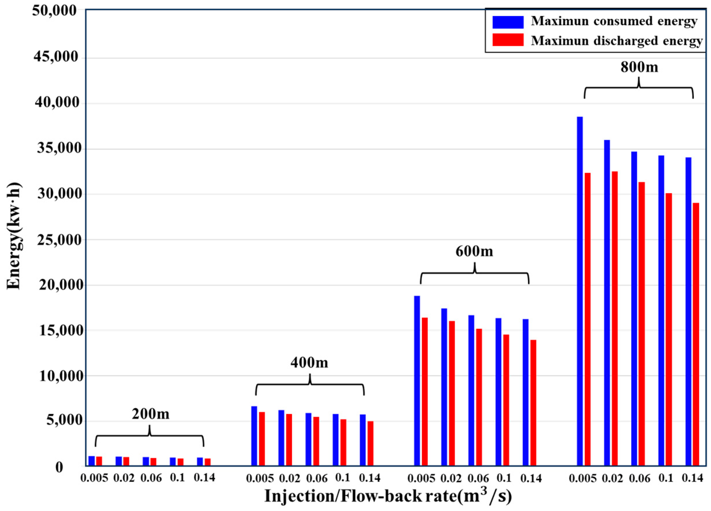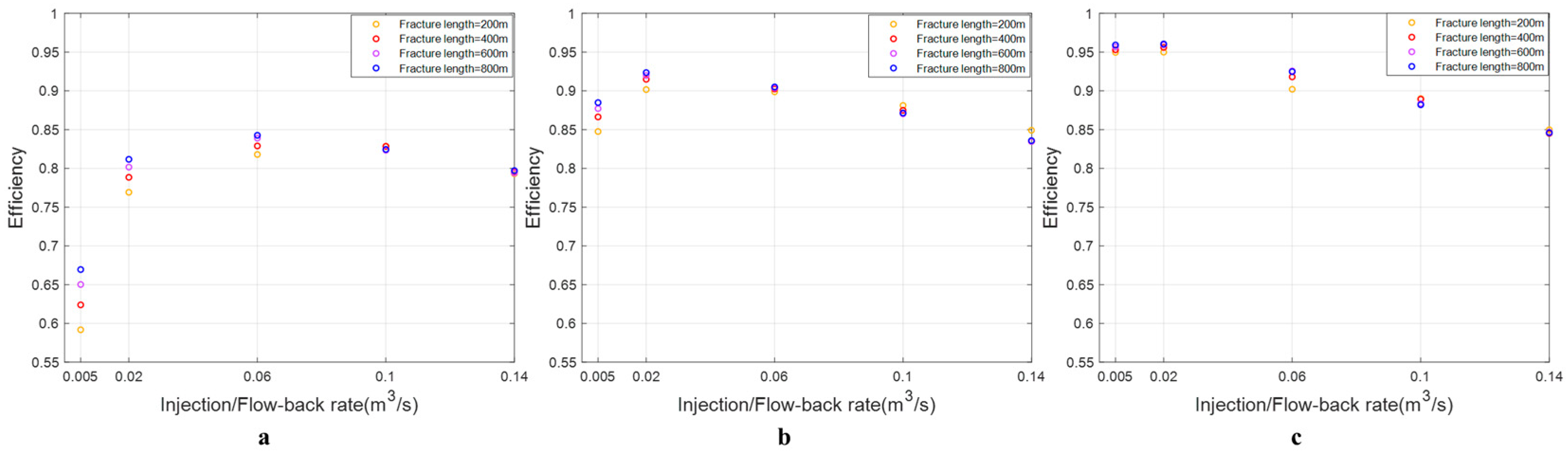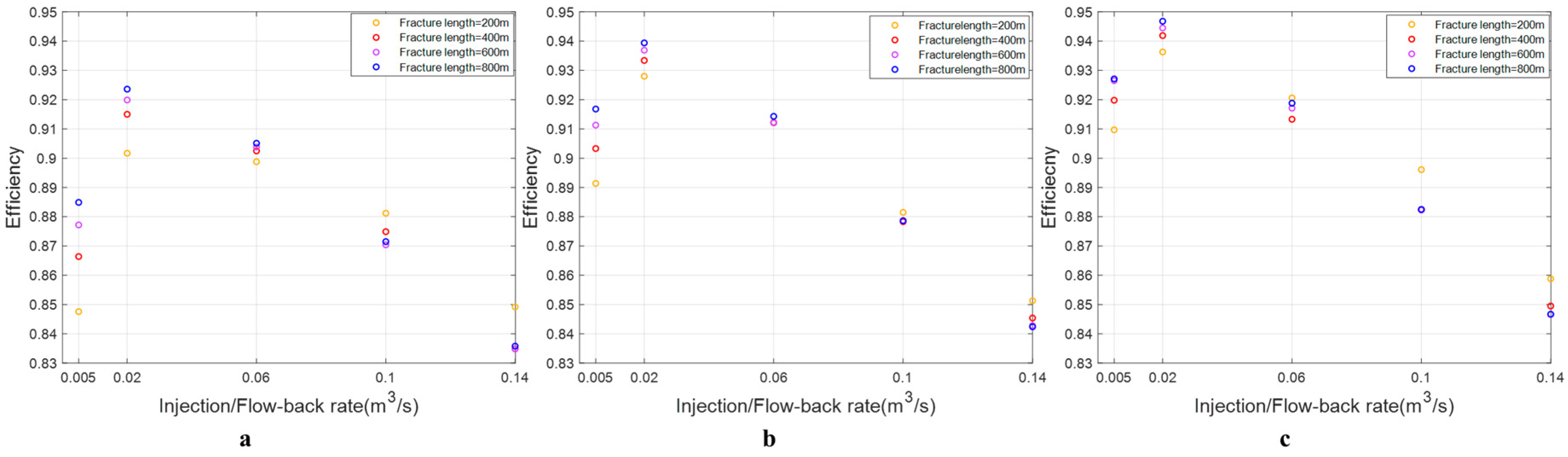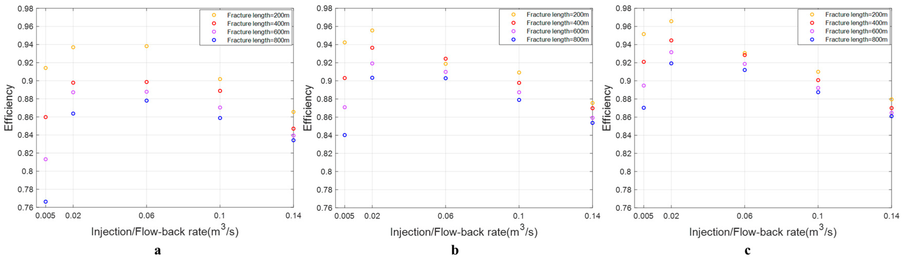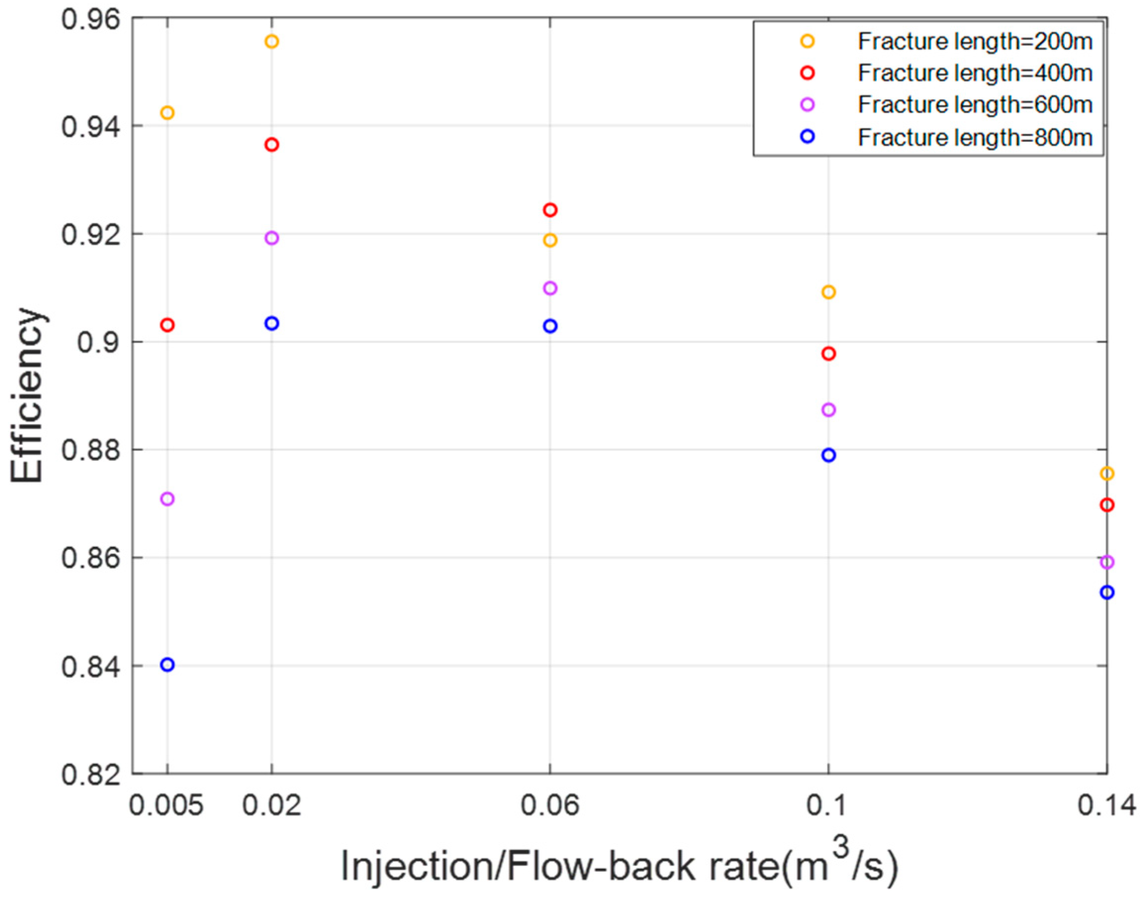 - The impact of injection/flow-back rate on energy storage efficiency in fractures of different sizes remains consistent, with efficiency initially increasing and then decreasing as the injection/flowback rate rises.