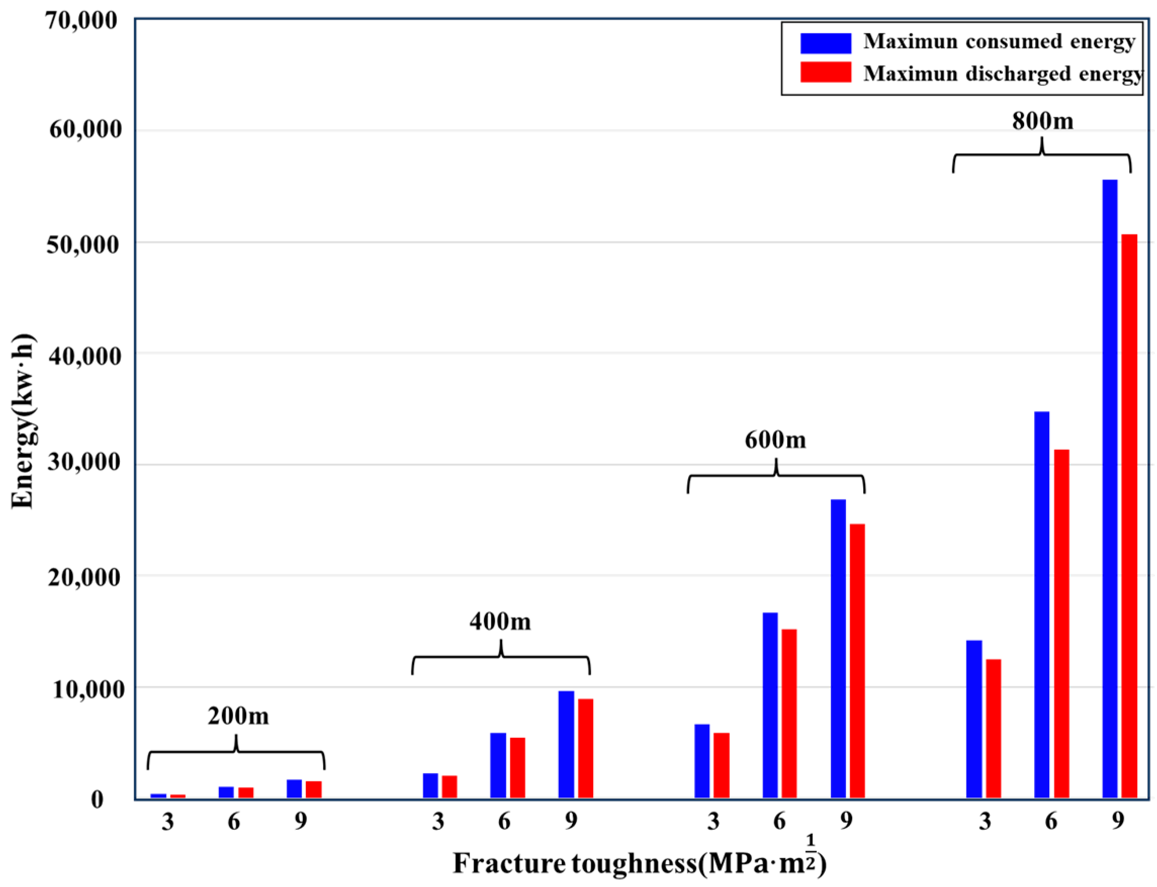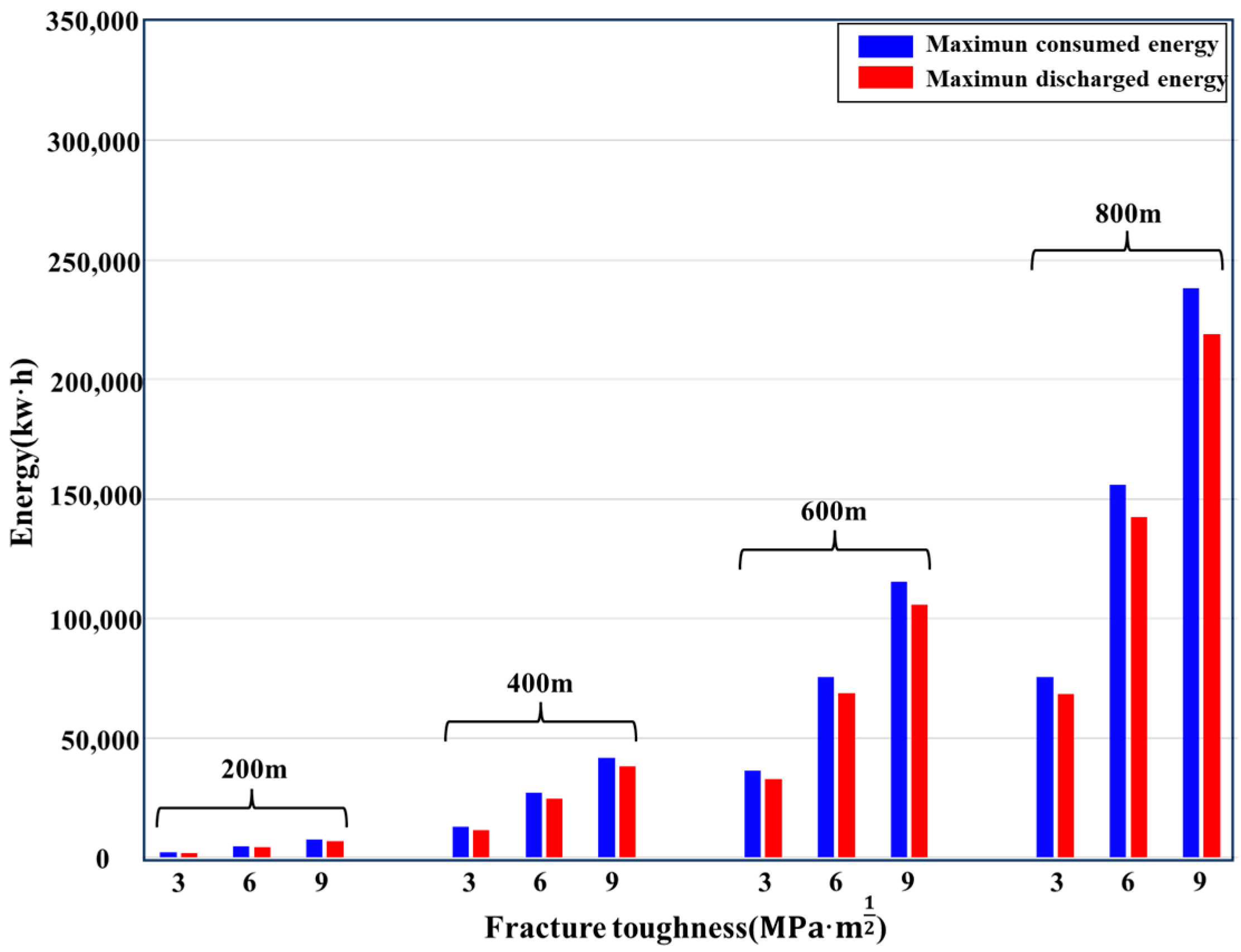 - Choosing reservoirs with higher fracture toughness not only fulfills larger-scale energy storage requirements but also enhances energy storage efficiency.