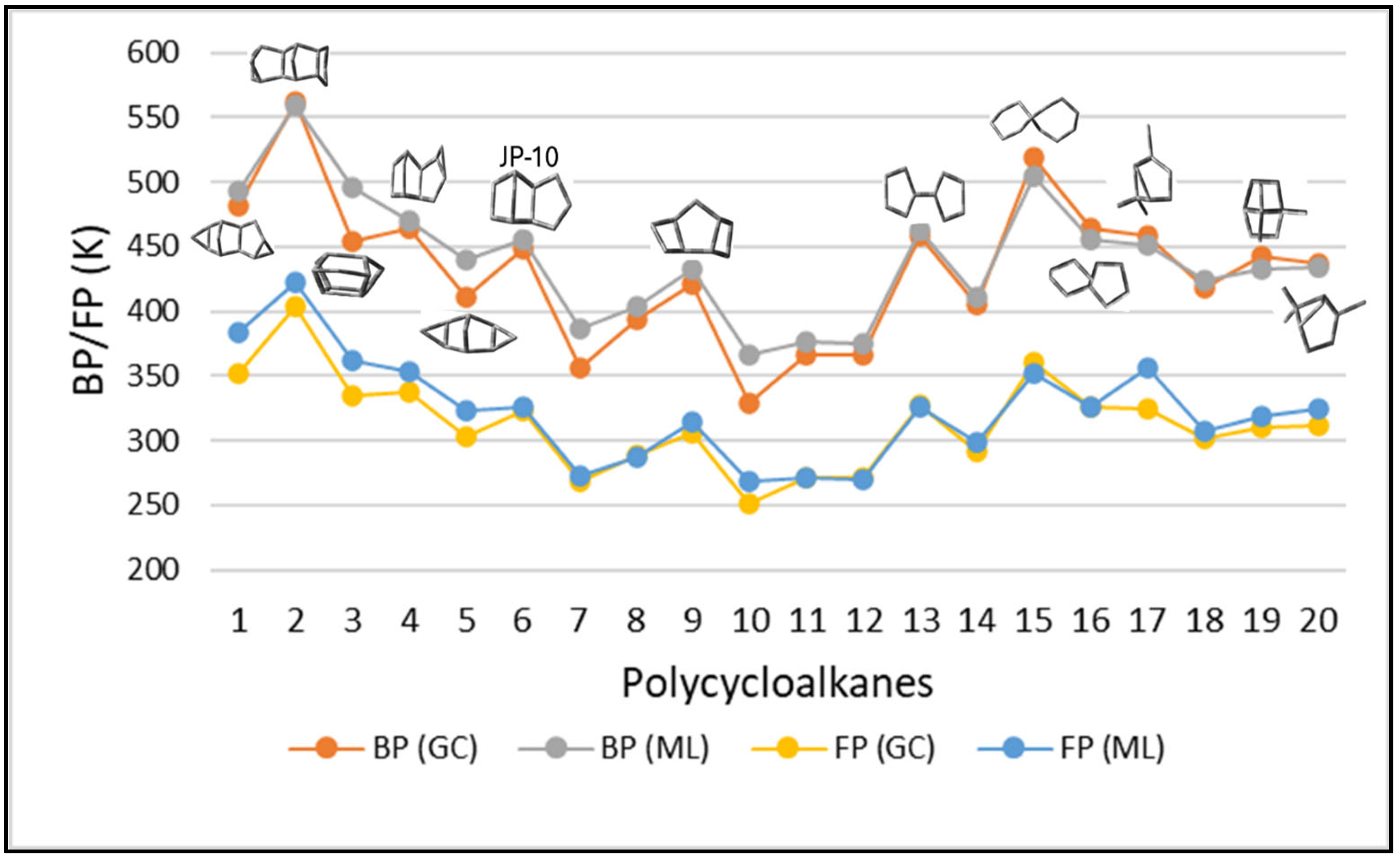 - Rijal, D.; Vasilyev, V.; Wang, F. Advancing Sustainable Aviation Fuel Design: Machine Learning for High-Energy-Density Liquid Polycyclic Hydrocarbons. Energy Fuels 2025, 39, 3243–3255. [Google Scholar] [CrossRef]