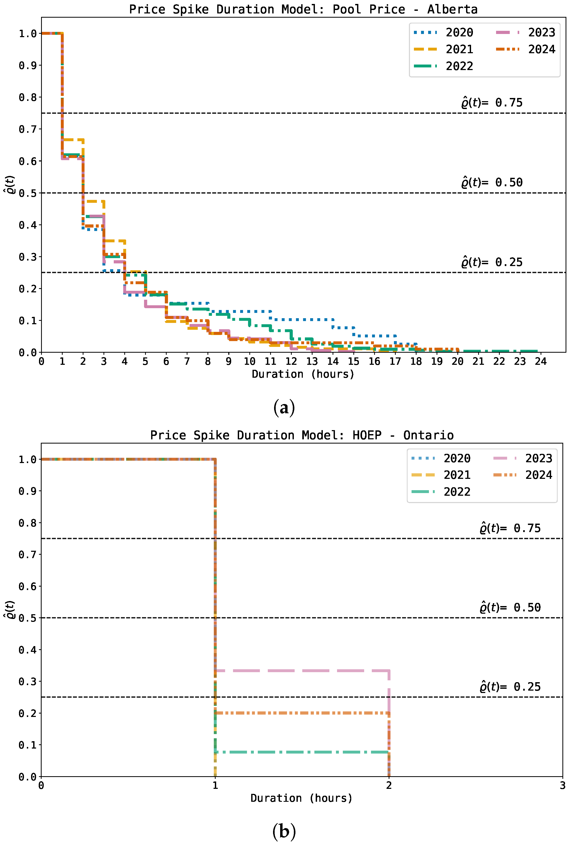h across all years and most markets, with the majority of spike events lasting between 2, 3, and 4 h, while fewer events last between 1 and 5 h. In general, Ontario’s market displays the shortest spike survival times, while also exhibiting the lowest survival probabilities (near