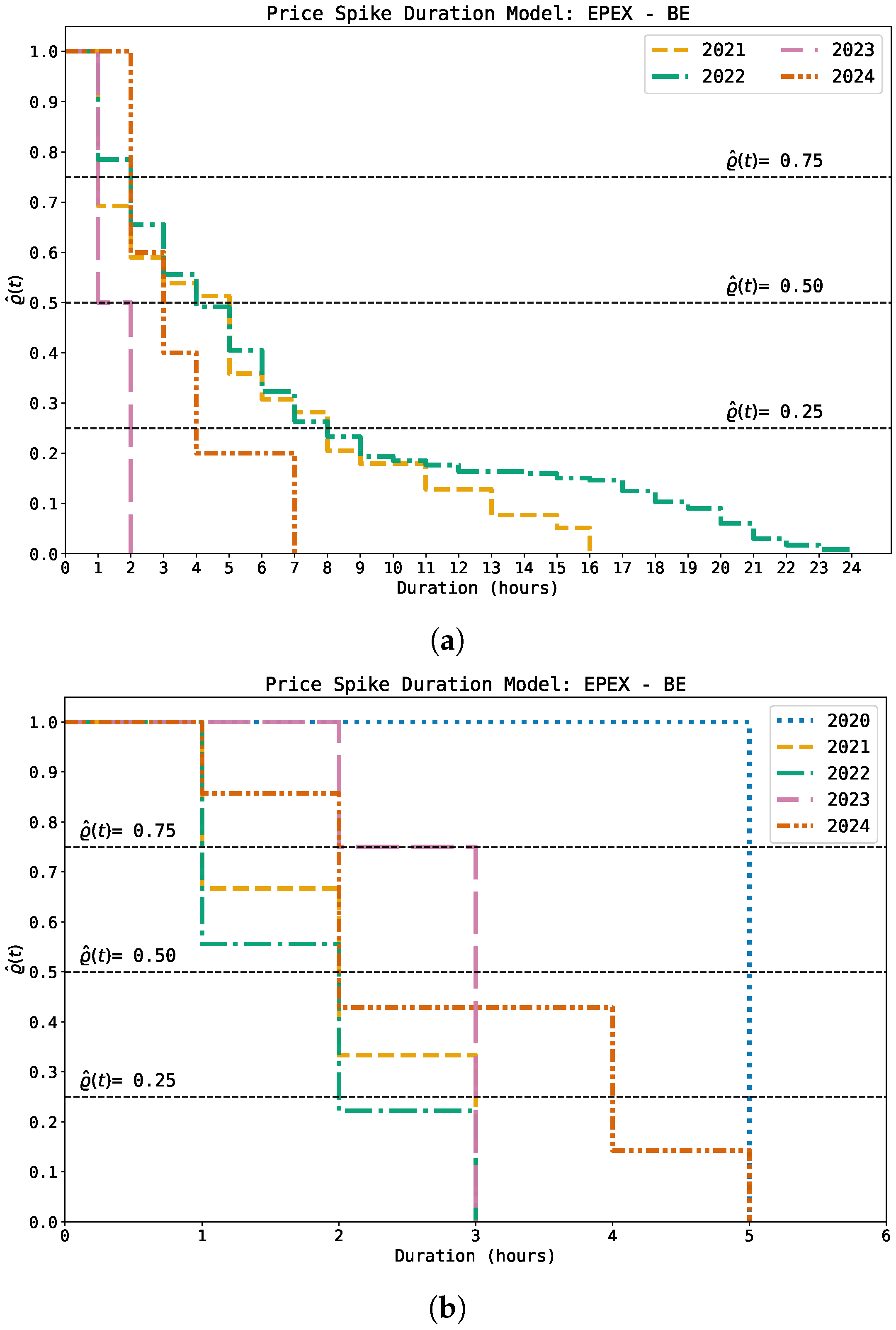 Furthermore, the survival of price spike events beyond 24 h is primarily associated with extraordinary circumstances, such as extreme weather events or geopolitical disruptions. In all such cases observed in this study, spike events exhibit low survival probabilities, for example, typically below
