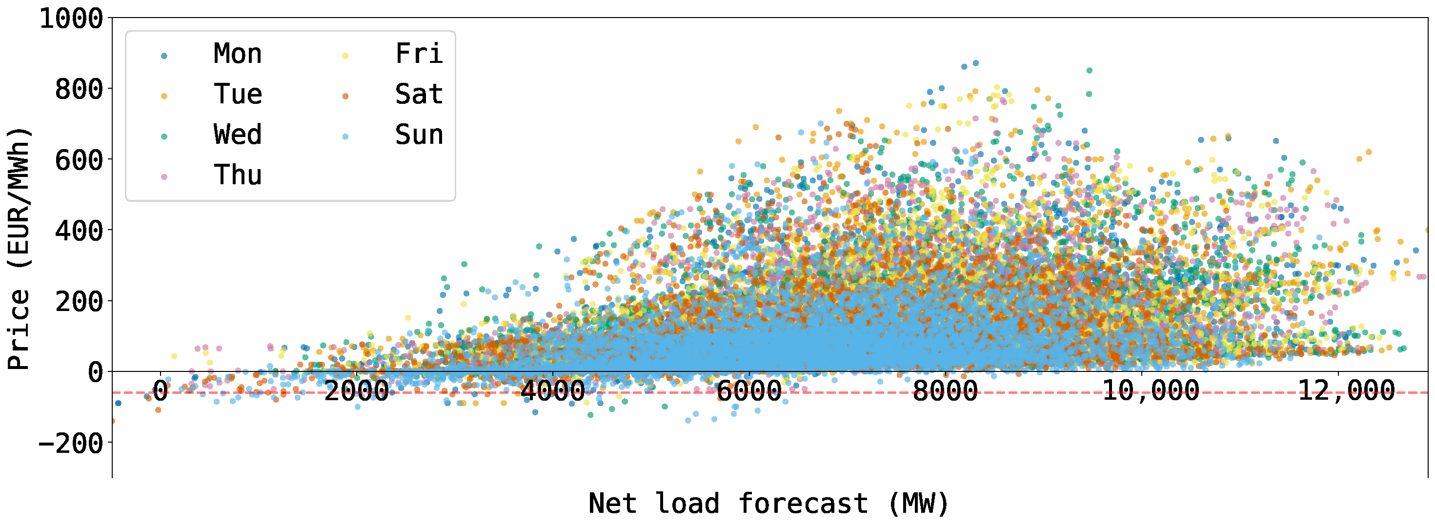 Figure 6, which shows a positive correlation between the spot prices and the estimated net load forecasts by day of the week to capture daily seasonality. In general, negative prices tend to appear at lower net load levels. Moreover, they are more frequently observed on weekends, when the net load is typically lower. The lower-left region of
