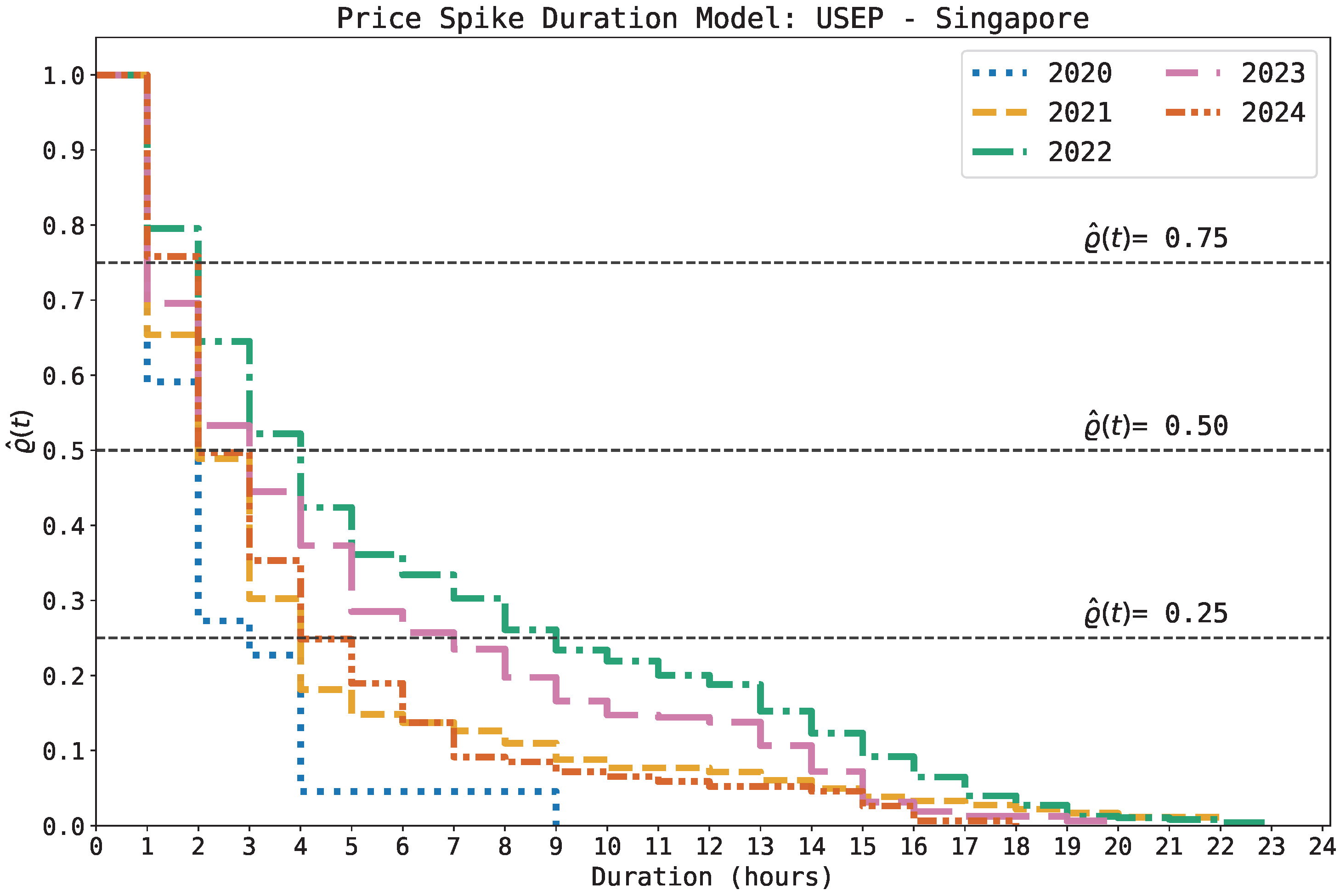 survival probability level, spike durations in Singapore’s market during 2022 are comparable to those in the EPEX-BE market (see the same year in