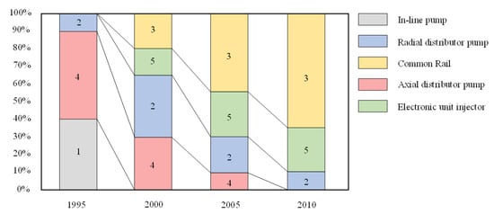 Different fuel injection system technologies have been employed in traction systems for obtaining the planned objectives. Figure 1 reports the European, US and Japan automotive market of popular injection systems in the period from 1995 to 2010: 1 is the in-line pump, 2 is the radial distributor injection pump, 3 is the CR, 4 is the axial distributor injection pump and 5 is the electronic unit injector (EUI). The introduction of more stringent emission standards during the late 1990s and the early 2000s in Europe, the USA and Japan required a new evolution of injection system technologies applied to direct-injection diesel engines. Injection timing delay had been the primary means by which NOx emissions were reduced up until the late 1990s, and the available electronically controlled fuel injection pumps could guarantee improved flexibility in the management of SOIs, compared to previous mechanical systems. However, there was a practical limit to injection timing delays due to an excessive increase in soot and HC increase or due to misfire [1]. The EGR fractions backing into the cylinder had been modest up to the late 1990s for both passenger cars and trucks, but higher demands on EGR systems were created with the emission standards introduced in the early 2000s, which triggered the introduction of sophisticated electronically controlled cooled EGR systems. Since either injection timing delays or EGR increases worsened soot emissions, an augmentation in the injection pressure or in the swirl level within the cylinder was essential to contain the PM. Larger injection pressures, combined with higher compression ratios, could also decrease the fuel economy penalty associated with delayed injection timings because they significantly reduced ignition delays [2]. Furthermore, an augment in the injection pressure allowed the rotational speed of a diesel engine to be increased because the raised injection pressure accelerated fuel evaporation and thus the combustion process. Finally, with high injection pressures, air swirl could be reduced, and this in turn diminished both the energy consumed in producing swirl and the heat loss to the coolant. In-line pumps and axial-piston fuel distributor pumps for passenger cars could not go beyond 550 bar and 700 bar, respectively, and these injection pressures could only be reached at high loads and speeds; for heavy-duty engines, the maximum injection pressures for these two injection systems could reach 1150 bar and 1300 bar, respectively. Electronically radial fuel distributor pumps and electronic unit pump systems were introduced in the mid-1990s and were able to provide a maximum pressure of 1500 bar for car applications and beyond for heavy-duty applications. However, both these systems enabled only simplified pilot–main injection patterns, due to the presence of significant lag and residual pressure wave dynamics along the long pump-to-injector piping system after the end of the injection. Instead, the EUI allowed for injection pressure levels to be raised up to 2000 bar [3,4,5] because of its reduced hydraulic capacitance, which was caused by the small high-pressure circuit volume between the pumping plunger and nozzle, and allowed multiple injections to be performed. From the late 1990s to the late 2000s, the EUI was the technology competing with the CR for application to diesel passenger cars and diesel light-duty commercial vehicles, although the final success of the CR system was unavoidable. This was primarily due to its general superior flexibility in the management of the injection train parameters in order to adapt combustion to the demands of the engine operating points in terms of performance, pollutant emissions and noise [6]. CR systems allow for flexible control of the injection pressure, independently of load, speed and injection hole diameter, whereas the injection pressure was affected by the cam profile, the working condition and the hole diameter in EUI systems. Another fundamental difference of the CR system compared to EUI systems is the constant fuel pressure at the nozzle during the injection period. In addition to this, although EUI systems are characterized by limited combustion noise, they generate much more mechanical noise than CR systems, due to the mechanical contact between the cam, rocker-arm and follower. It has been proved in [7] that any modification in the EUI system design leading to a higher injection pressure and to steeper pressure gradients in the plunger cavity induces an increase in the mechanical noise and vice versa. This trade-off between mechanical noise and hydraulic performance represented a dramatic and unsolved dilemma of the EUI. Furthermore, EUI systems could not perform more than three shots per engine cycle because only the central portion of the pumping plunger stroke could be exploited for programming injections [8]. The implementation of multiple injections with reduced dwell time between the subsequent shots was another challenge for the EUI. In fact, the key to performing multiple injections with reduced dwell time resides in the two-stage layout of the CR injector (pilot stage and main stage): among all the examined fuel injection systems, the CR injector is the only one equipped with an integrated pilot valve. Finally, the introduction of the diesel particulate filters for limiting PM required efficient regeneration strategies. One of the simplest strategies consisted of the application of one or more shots close to exhaust valve opening [9]: this was an easy solution for the CR but was not practicable for the EUI [10,11]. Since 2010, CR systems have practically become the only universally applied injection technology for passenger cars and light-duty commercial diesel vehicles: they progressively spread even in the fields of trucks, tractors and off-road vehicles for reasons related to scale economy. During the early 2010s, the diesel engine passenger cars sold in Europe were able to 