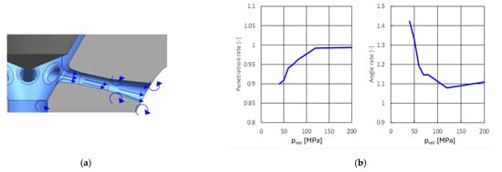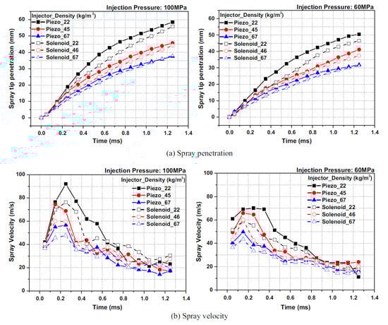 Figure 3a [17] shows the spray penetration, which is the distance from the nozzle tip to the farthest spray zone from the nozzle tip, and fuel droplet velocity, respectively, for 60 and 100 MPa and three air densities (22 kg/m3, 45 kg/m3 and 67 kg/m3) in the injector discharge environment of the bomb. The sprays injected from the holes of the piezoelectric injector grow faster at the beginning of injection (the solenoid and piezoelectric injectors have the same hole diameter). When the charge density is lower, due to smaller resistance for the sprays, the difference between the two injectors in terms of spray penetration and velocity are more obvious.