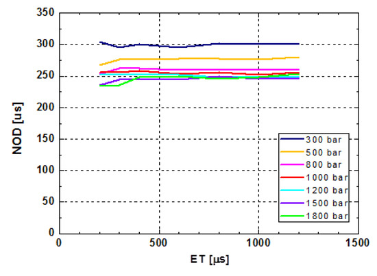 Tests were made with IAS injectors featuring the same control chamber volume, diameters of the A and Z holes, needle spring preload, as well as the geometry and material of the needle, as those of the IAP injectors in Figure 4. The NOD values of such IAS injectors also ranged from 250 μs to 300 μs and decrease when increasing the rail pressure. This definitely proved that the driving system itself did not play a major role in influencing the dynamic response of the injector. The inconsistencies found in the literature about the differences in NOD values between solenoid and piezoelectric injectors (they range from 100 to 150 μs) [17] are mainly ascribed to differences in hydraulic and mechanical parameters between the two injectors.