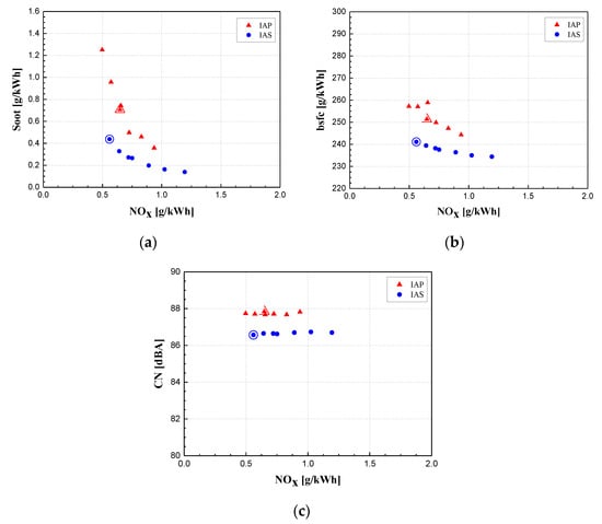 Emissions, fuel consumption and combustion noise at 2000 × 5: (a) Soot-NOx trade-off; (b) bsfc-NOx trade-off; (c) CN-NOx curve [40].