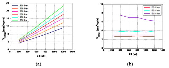 Finally, variable shaping of the injected flow rate in direct-acting piezo-injectors is guaranteed by the possibility of performing a boot injection (cf. Section 2.2.1), which offers additional degrees of freedom for more efficient management of the complex trade-off between emissions, fuel consumption and combustion noise [36,37]. All this explains the great attention that has been paid to direct-acting injectors by the automotive scientific community. Despite all the studies on hydraulic performance and fuel spray, which illustrated the features and the potentiality of direct-acting piezoelectric injectors [38,39], there are only a few works that tried to reveal the real benefits of the direct-acting technology of the injector on engine-out emissions, fuel consumption and combustion noise. In [40], the hydraulic and engine performances of indirect-acting and direct-acting piezo-driven injectors have been compared under various working conditions with reference to a Euro 5 diesel engine for a passenger car. Figure 8 reports the volumetric injector leakage measured at 30 °C (Vleakage). In the case of the IAP injector, Vleakage is the sum of the static and dynamic leakages per engine cycle. Dynamic leakage increases with the value of ET, whereas static leakage mainly depends on pnom. For the DAP injector, only the static leakage has to be taken into account since there is no pilot valve.