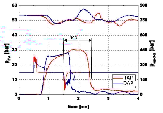 Time histories of pinj,in and pEVI (prail = 500 bar) [15].