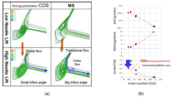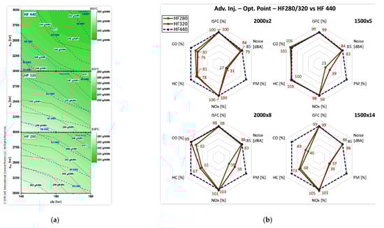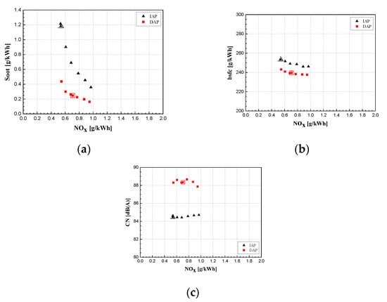 Emissions, fuel consumption and combustion noise at 2000 × 5: (a) IAP; (b) DAP [40].