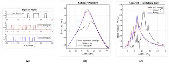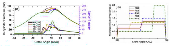 Simulation results: in-cylinder pressure and HRR traces (a) and corresponding injection rate profiles (b) [36].