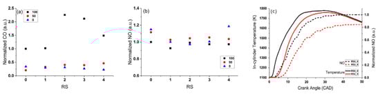 Figure 12a,b shows the simulation results for the normalized CO and NO emissions of all the injection velocity profiles in Figure 11b (only black symbols are of interest because they pertain to pure diesel fuel) and also includes the in-cylinder temperature and NO crank angle evolutions for the RS0 and RS2 cases (cf. Figure 12c), which however refer to kerosene as a fuel (the differences, compared to petrodiesel, show lower kinematic viscosity, by 35%; lower density, by around 4%; lower surface tension, by 8%; lower cetane number, by around 20%; and lower volumetric fraction of aromatics, by around 60%). NOx emissions are generally seen to decrease slightly when boot injection rate shapes are used in place of the conventional rectangular injection rate, i.e., RS0. Boot injection should determine lower injected flow rates and thus lower local temperatures in the initial premixed combustion, which in turn influence the subsequent maximum temperature values in correspondence with the diffusion flames, thus limiting NOx emissions. Figure 12c shows that the RS2 case has an overall lower in-cylinder temperature than the RS0 case, which may imply that there are fewer local high-temperature regions during the combustion of the RS2 case, as compared to the RS0 one. The lower overall in-cylinder temperatures determined by the boot injection are also the cause for the higher CO emissions of the boot-shaped profiles.