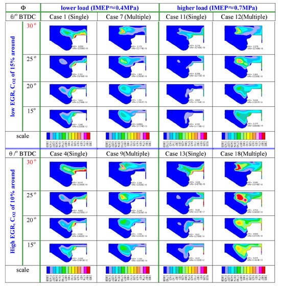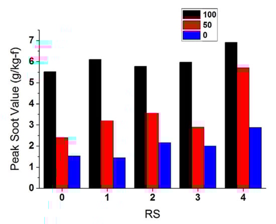 Figure 13 reports the numerical soot peak values for the rectangular injection rate and boot injection rate shapes (cf. black bars). More soot is generally generated when the boot injection is implemented. The diminished injection pressure and velocity of the fuel droplets under early-injection conditions decreases the depth of the spray penetration [42], leading to reduced air-to-fuel mixing, although the reduced fuel momentum during the initial stage of the injection can avoid liquid fuel wall impingement and flame quenching [38]. Once fuel ignition has occurred, the feeding of more fuel to the combustion process, that is, the passage from boot injection to the subsequent injection phase, in which the needle is completely open and the injection pressure increases (in Figure 11b, during this phase, the fuel velocity is larger for the case with the boot than for that without it), allows for the mixing of fuel with air to be enhanced and soot to be contained [43]. In fact, the temperature levels rise in the late burn out phase, and this leads to good oxidation of soot, even though the peak temperature during premixed combustion is lower than in the absence of boot injection. On the other hand, the increase in the fuel pressure during the last part of injection augments the risk of interaction between the injected fuel and the combustion flames, thus increasing the probability of soot formation.