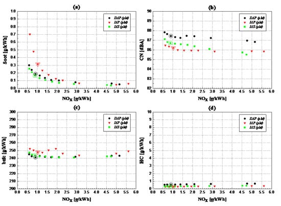 (a) Soot, (b) CN, (c) bsfc; (d) HC versus NOx (EGR sweeps) at 2000 × 5 for IAS, IAP and DAP injectors [50].