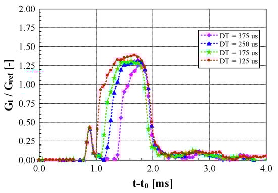 For the DAP injector, even though the pinj,in oscillations are significant in Figure 9, the injected mass fluctuations with respect to DT in multiple injections virtually disappear since the needle is not ballistic: the maximum needle lift is always reached, independently of the pilot-injection-induced pressure wave dynamics [30].