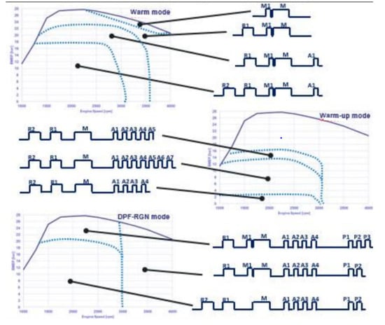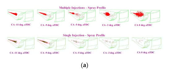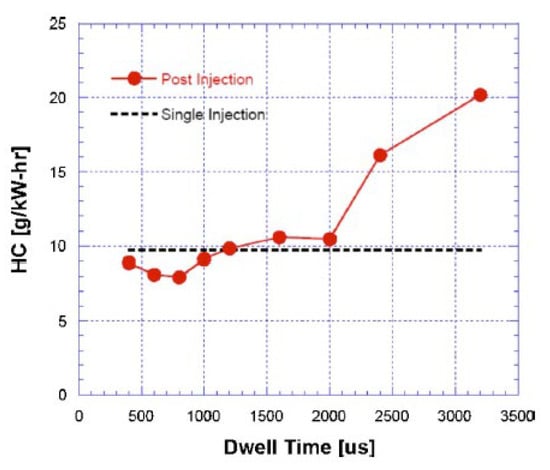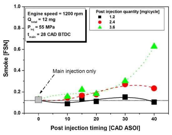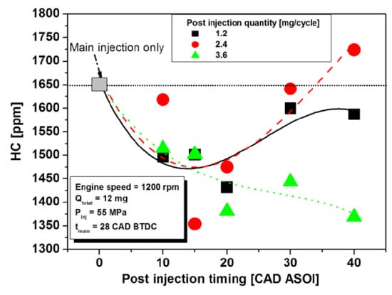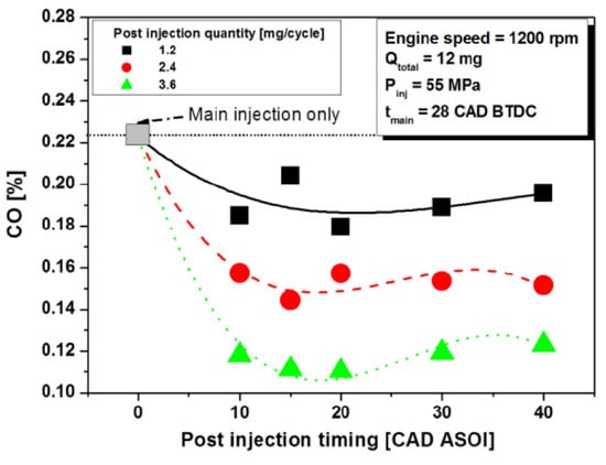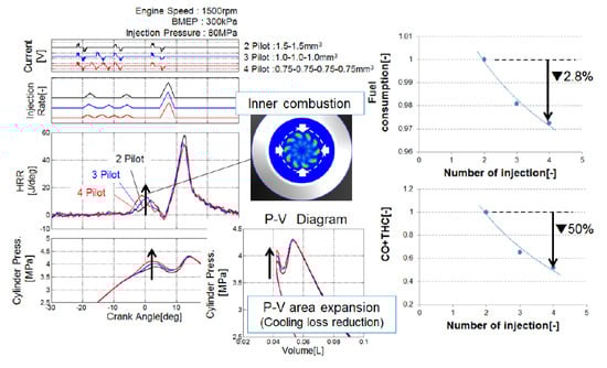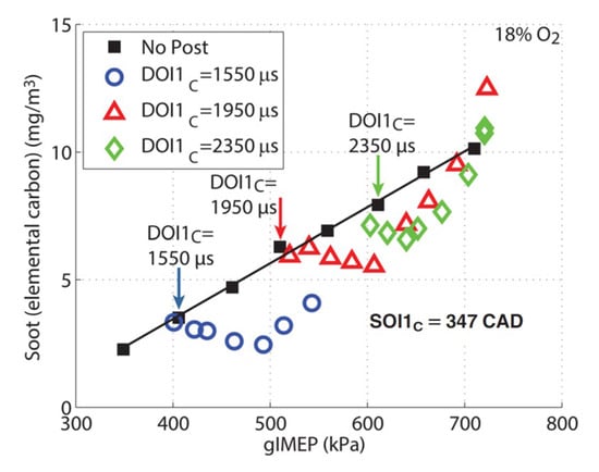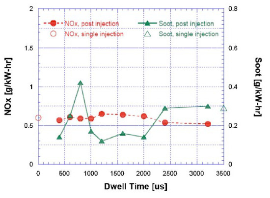 After injections are characterized by a very short ignition delay and primarily aimed at reducing the soot emissions. Unlike pilot injections, which do have major impacts on the main injection combustion process, after injections seldom have an impact on pilot injections and on the first part of main injection combustion processes. In this sense, after injections are almost “independent” of pilot and main injections. In particular, applying pilot injections or not will not markedly affect after injection’s effects on emissions [76].