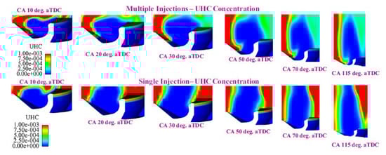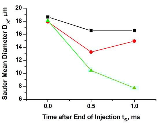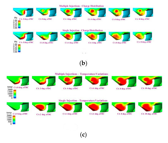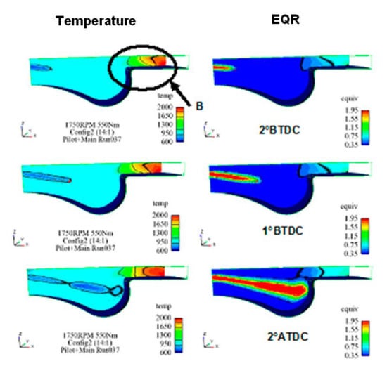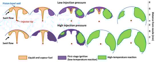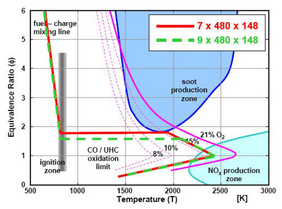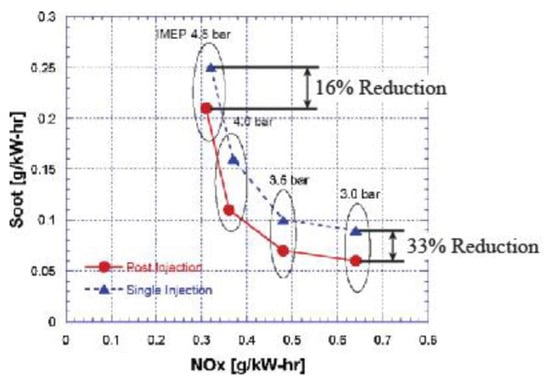 The other popular theory which explains the effect of the after injection on soot emissions by means of the interaction between the main and after combustion events is generally based on two mechanisms: enhanced mixing and temperature effect. Several studies have presented the explanation that after injections reduce engine-out soot by enhancing mixing within the cylinder [81]. Turbulence introduced by the after injection fuel jet brings fresh oxygen to the soot from the main injection, enhancing oxidation of this soot, while simultaneously burning the after injected fuel: the after injection redistributes the fuel from the main injection, creating a more well-mixed fuel–air distribution with smaller and less fuel-rich soot-forming zones [82]. In other words, the enhanced mixing by the after injection increases the flame area, thereby increasing the rate at which soot is oxidized. If enhanced mixing is the key, spray/swirl/wall interactions and swirl/squish interactions become important: this is the case of small-bowl light-duty engines, especially in past setups [55]. The disparity in after injection efficacy among studies on interactions between main and after shots may be explained to some degree by differences in spray/flow/wall interactions [52]. Other studies have argued that as the after injection fuel burns, the increased temperature from the additional heat release can enhance the oxidation of soot from the main injection, thereby reducing engine-out soot [9,81,83,84].