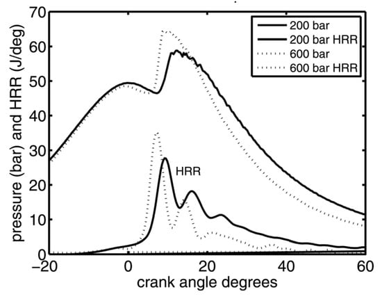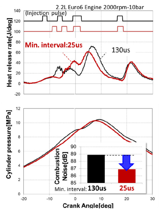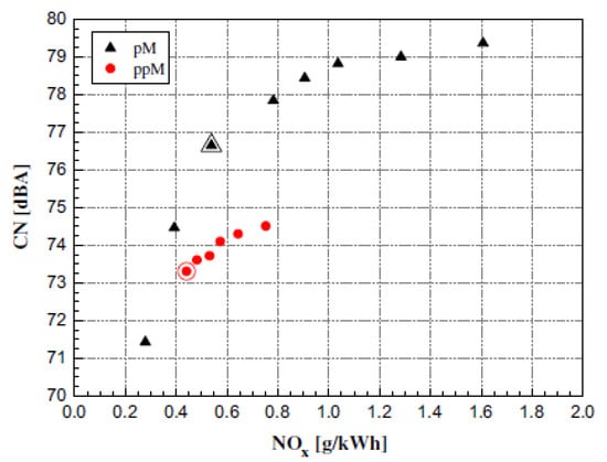 Pilot injections are effective in decreasing combustion noise, especially at idle, low and medium loads, by lowering the HRR peak of the main combustion, and this is often referred to as their primary benefit [55]: reductions of up to 5–8 dB are generally obtained in the CN value, compared to single-injection strategies, over the whole engine working area, even though the most obvious benefits are obtained at low loads and at idle [56], where the fuel ignition delay is larger. Combustion noise normally decreases if the pilot injected mass increases, whereas the dependence of CN on the pilot–main dwell time is more complex because this trend is affected by the entity of the pilot injected mass, even though a decrease in combustion noise is generally observed as the dwell time is reduced [57].