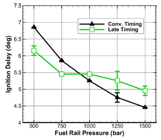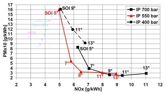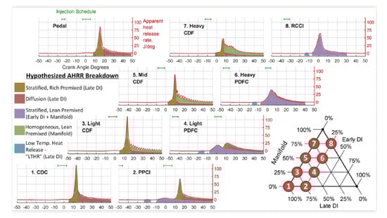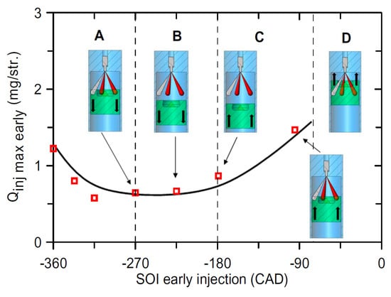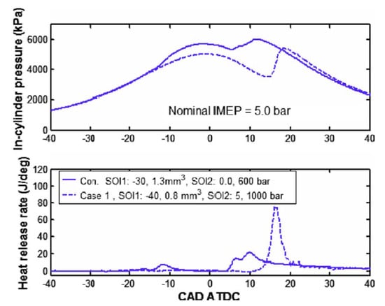 The discussed effects of the pilot injection, i.e., diminution in the ignition delay and reduction in CN, are typically achieved at low and medium loads when the pilot injection is performed with SOIpil in the 5–25 CA BTDC range. When SOIpil is in the 25–40 CA BTDC range, it is referred to as an early pilot in the context of conventional diesel combustion (these injection timings were traditionally typical of low-temperature combustion): the fuel fraction burned in the premixed phase is greater than in the case without an early pilot. This can help to obtain more homogeneous air–fuel ratios and temperature distributions within the combustion chamber, thus limiting the NOx and soot production, according to a milder approach than that of LTC. Hence, two opposite effects can be ascribed to the pilot injection, depending on SOIpilot.