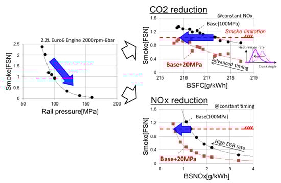 In general, the pilot injection can be exploited in different ways to improve engine-out emissions, CN and fuel consumption, depending on the working point [75]. Soot emissions are not relevant at low engine speeds and loads, and NOx and noise are usually controlled, at these conditions, by means of adequate EGR rates (up to 40% for conventional combustion). Hence, the pilot injection is typically optimized, on the basis of the EGR rate, in order to reduce HC and CO emissions, which tend to be high, due to the presence of lean and cool regions. In particular, the HC and CO emission situation becomes worse at engine cold-start and warm-up, when the oxidation catalyst has less conversion efficiency. Soot, NOx, noise and bsfc are the dominant problems at medium-load conditions, i.e., in the higher-load zone of the NEDC region, whereas HC and CO are not of great concern. Pilot injections are therefore used in these conditions to improve PM-NOx and bsfc-NOx trade-offs and, above all, CN performance. At high loads, the total fuel mass per cycle is large. Although pilot injected fuel could improve the fuel–air mixture environment, the combustion is predominantly diffusive; the pilot fuel is relatively small, compared to the main injected fuel mass; and hence, it does not appreciably change the main combustion features. Therefore, at high loads, pilot injection cannot generally be applied to reduce the emissions significantly. Only when pilot–main injection intervals and pilot injected masses are large (an early big pilot is used) can appreciable smoke reduction be achieved because the main injection is shortened, although there is a penalty on CO emissions (there is no significant impact on NOx and bsfc) [76]. In particular, when the maximum torque is smoke-limited, an early big pilot injection can increase the full load torque by improving the utilization of the air within the cylinder, compared to the case of a single injection with a longer energizing time and in the presence of EGR [77]. In this case, pilot injection also improves combustion efficiency. Moreover, pilot injection can be used at full load to limit the peak in-cylinder pressure and the engine exhaust temperature. The pilot injection therefore allows for either the fuel rate to be increased or the mechanical and thermal stresses in the engine to be reduced, thus providing possible weight savings or simplifications of the cooling circuit. Although pilot injection has generally been applied to improve pollutant emissions, noise or maximum torque, it can also be used for other purposes and offers other benefits. An early pilot injection can be applied to increase the in-cylinder pressure at the end of the compression stroke during engine cranking, thus reducing the engine start time. Furthermore, pilot–main injection patterns reduce the cycle-to-cycle variability of the torque, compared to single injections [54], and this induces more stable engine operations after the engine crank phase, especially during a cold-start. It can also improve combustion noise during engine start [70], but, at these engine working conditions, other sources of noise (gas flow and mechanical noises) dominate in the vehicle.