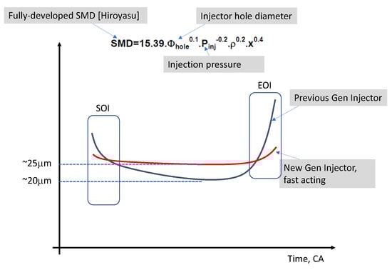 The higher spray velocity of piezoelectric injectors (cf. Figure 3b [17]) leads to smaller fuel droplet sizes. More effective vaporization of the fuel spray improves the spatial distribution of the fuel and flame in the combustion chamber and is therefore desirable. Other experimental results showed that spray tip penetration was not influenced significantly by the injector driving system [23]. In fact, although the liquid jet penetration of piezo injectors was higher than that of solenoid injectors [25], the quicker vaporization of the liquid fuel for the piezo injector can compensate for the previous effect since the penetration of a liquid spray is more effective than that of a vaporous one. The results in Figure 3a also show that the penetration differences significantly decrease as time passes.
