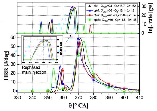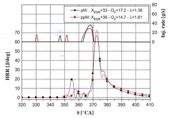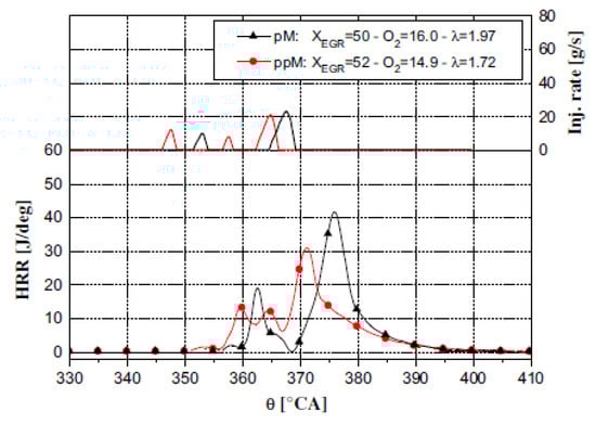 The combustion of the pilot injected fuel causes a slight increase in the in-cylinder gas pressure and temperature before the main injection has occurred and therefore leads to a considerable reduction in the ignition delay of the main injection [53]. This reduction in the fuel ignition delay limits the impact of the premixed combustion and generates a less rapid heat release rate [51] during the main injection than in a single-injection schedule [54]. The last effect is also related to the oxygen quantity consumed during the pilot combustion and to the consequently reduced oxygen availability during the main combustion. Furthermore, the high thermal capacity products of the pilot combustion can be entrained in the main fuel spray and play the role of an internal EGR, thus lowering the HRR peak. As a result, the main combustion becomes predominantly mixing-controlled [51] and the entire amount of fuel chemical energy is released over a prolonged time interval, thus determining a longer combustion than for the single-injection case.