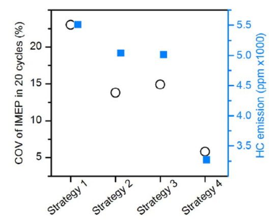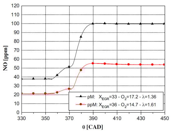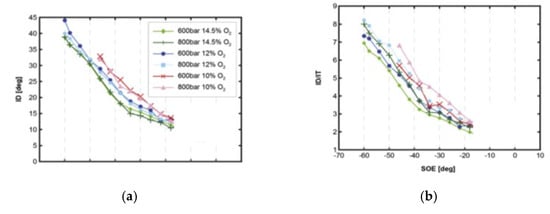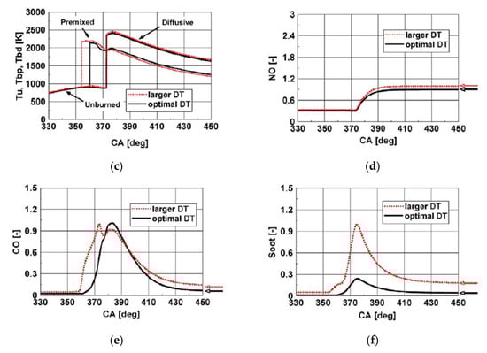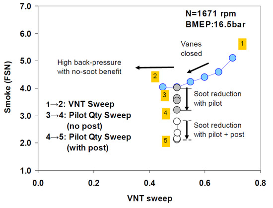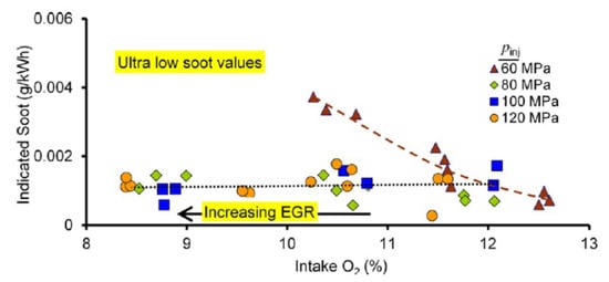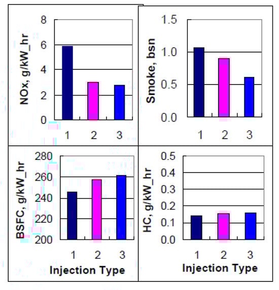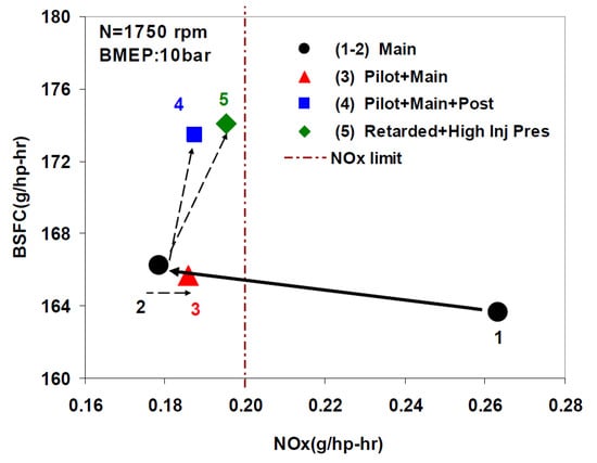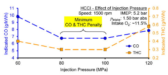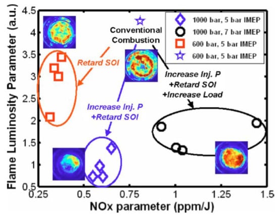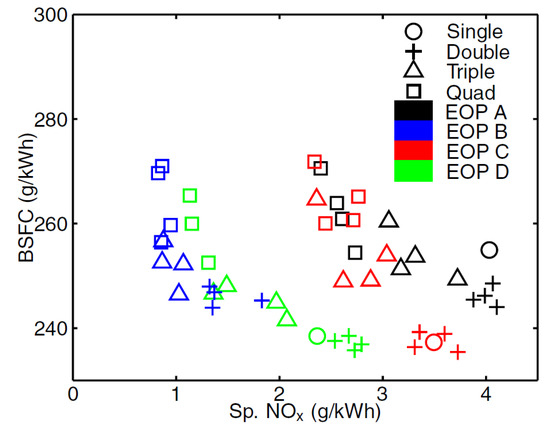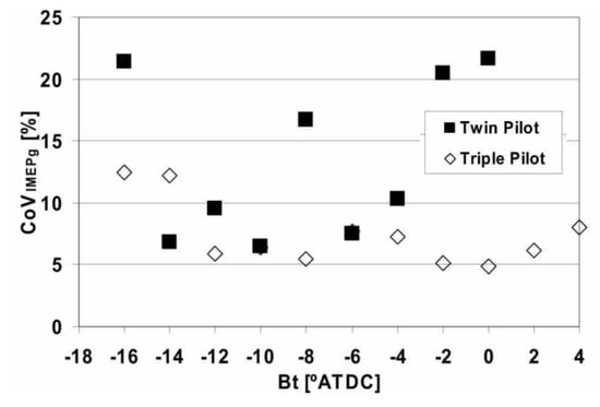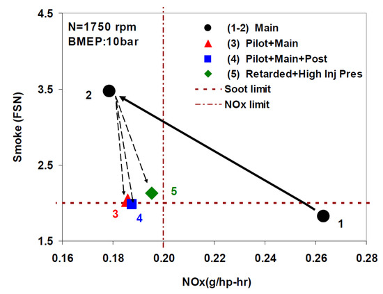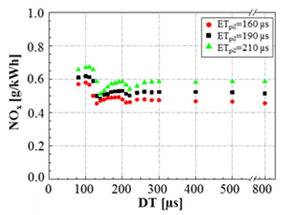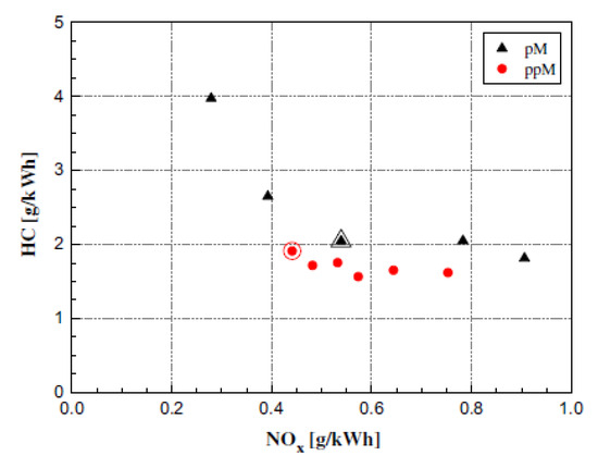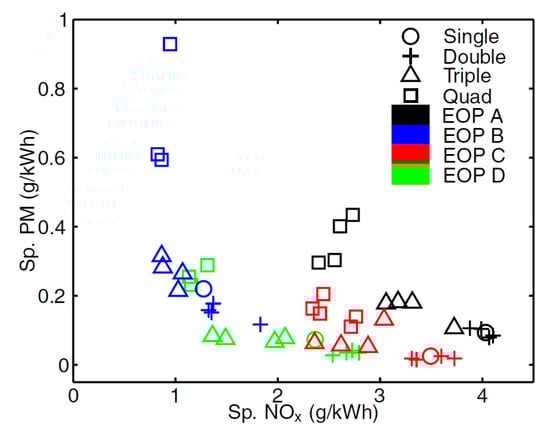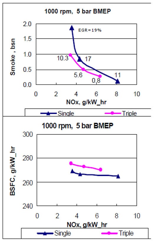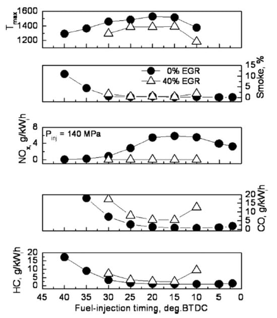 As far as the HC and CO engine-out emissions are concerned, at low BMEP values, they generally decrease if a pilot injection is implemented because the occurrence of overmixing during the main injection is less likely [62]. In particular, the CO conversion rate improves during the main combustion because of the relatively high in-cylinder temperature and the shorter ignition delay of the fuel injected in the main injection [54]. Instead, at medium BMEP values, the introduction of the pilot injection does not generally improve the HC and CO emissions, compared to the single-injection case, and this is confirmed in many investigations [71]. HC and CO emission characteristics show quite similar tendencies with respect to SOIpil and pilot mass: the levels of both emissions generally increase with earlier SOIpil or when the pilot mass increases excessively. These phenomena can be explained based on two mechanisms. The first is that the amount of fuel wetted on the cylinder wall, crevice and boundary layers can increase because fuel over-penetration occurs, due to low ambient temperature and pressure conditions during early pilot injection (SOIpil up to around 40 CA bTDC); this wetted fuel is then emitted in the form of HC emissions. Moreover, injecting more fuel during pilot injection generally results in more fuel wall wetting. In particular, HC and CO emissions drastically increase with an SOIpil earlier than 30° BTDC and a pilot injection quantity greater than 5 mg (this cannot be the case at low loads). In [72], the fuel spray injected at 40° BTDC reaches the cylinder wall: this results in combustion in the quench zone and adhesion of part of the fuel on the cylinder walls, causing an increase in HC and CO emissions. Even though the fuel does not impinge on the walls, the mixture can reach the vicinity of the chamber wall and, due to the relatively lower in-cylinder temperature and pressure near the chamber walls, this fuel–air mixture may not burn, resulting in increased HC and CO emissions. The second mechanism is based on the fact that higher HC emissions may originate from locally lean regions becoming even leaner and thus too cold for complete reactions [73]. While the first mechanism gives increased HC and CO emissions as either DT (let us suppose that SOImain is fixed) or ETpil grows, the second mechanism makes HC and CO emissions rise with either increasing DT or reducing ETpil since the occurrences of overmixing are more likely if the pilot injected mass diminishes or DT grows. Therefore, when CO and HC emissions grow with increasing ETpil, the first mechanism prevails over the second; instead, when CO and HC emissions augment with reducing ETpil [66], the opposite occurs.