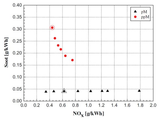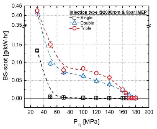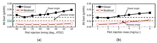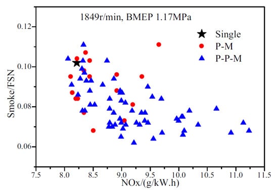 The smoke emissions of the pilot–main injections generally tend to increase, compared to the single injection, in the classic theory of emissions [62]. In fact, the pilot injection increases the in-cylinder temperature and decreases the oxygen concentration in the gases before the main injection has occurred. Both of these effects generally make the smoke emission formation grow; in particular, the increased temperature mainly acts by reducing the lift-off length (this is defined as the shortest distance between the nozzle tip and the stabilized combustion flame, cf. Section 4.2.4), which pertains to the main injection, with a subsequent increase in the equivalence ratios close to the nozzle. The insufficient mixing of fuel with air, which is due to the shortened ignition delay of the main injection, augments the percentage of diffusion combustion in the main combustion, and as a result, the amount of engine-out soot can grow significantly [61]. The pilot injected quantity should be below a certain threshold (a general value of 4–5 mg is normal) in order to contain the amount of smoke [63], and a small mass of pilot injected fuel will not vary the PM emissions appreciably [64].