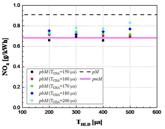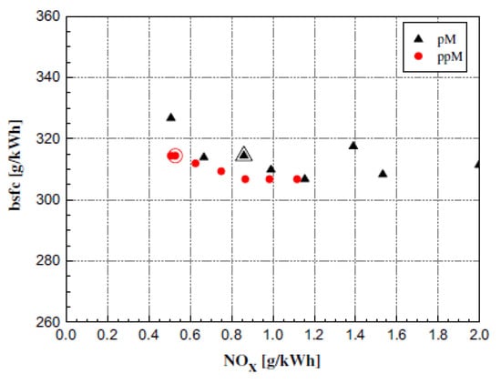 In Figure 15 [40], the engine performance of the pilot–boot–main (pbM) injection schedule, which has been implemented on a DAP injector with different combinations of TCHA and THLD, has been compared with that of the ppM strategy performed on the same injector. The statistically optimized calibration of the DAP injector for the ppM injection schedule has been used as a reference for the implementation of injection rate-shaping strategies. In other words, the boot injection was considered as a pilot shot fused with the main shot and the optimization of the pbM was assumed to be similar to that of the ppM because, in the latter strategy, the later pilot was phased very close to the main injection. When TCHA or THLD are varied, SOImain is also changed in order to maintain the same combustion barycentre (MFB50) as in the original ppM calibration.