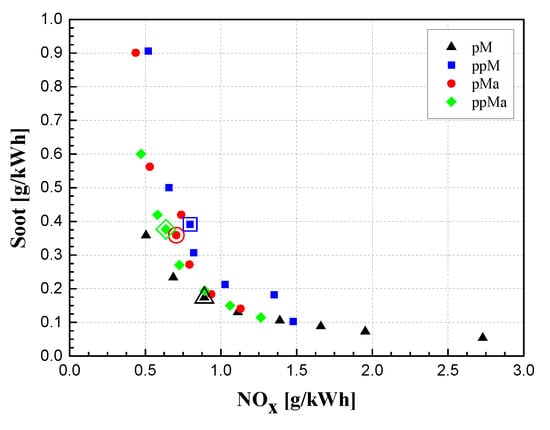 - Nishiumi, R.; Yasuda, A.; Tsukasaki, Y.; Tanaka, T. Effects of Cetane Number and Distillation Characteristics of Paraffinic Diesel Fuels on PM Emission from a DI Diesel Engine; SAE Paper 2004-01-2960; SAE: Warrendale, PA, USA, 2004. [Google Scholar]