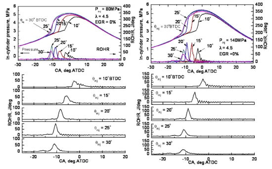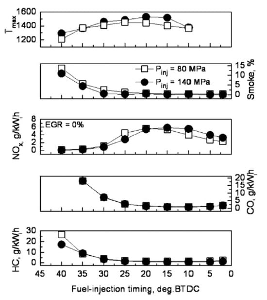 - Shameer, P.M.; Ramesh, K. Assessment on the consequences of injection timing and injection pressure on combustion characteristics of sustainable biodiesel fueled engine. Renew. Sustain. Energy Rev. 2018, 81, 45–61. [Google Scholar] [CrossRef]