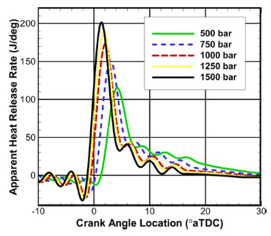 As the boot injection velocity decreases (RS0 to RS1 to RS2) or the boot injection duration increases (RS3 to RS2 to RS4), the ignition delay period increases. Although the reduction in both injection pressure and velocity could extend the autoignition delay, which could lead to a greater amount of fuel being injected before combustion starts, this event has only been shown to exert an influence of secondary importance [41]. In fact, it is the effect of the reduced flow rate over the boot injection period that prevails: hence, the injected mass prior to autoignition reduces in the presence of the boot injection, and atomization is also poorer. As more fuel is injected subsequently, combustion intensifies during the later stages and the peak heat release is seen to shift in the presence of the boot injection rate shapes. In other words, heat released during the premixed combustion phase diminishes, thus determining a significant reduction in combustion noise, while heat released during the mixing-controlled combustion phase increases [38,41].