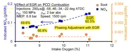 In general, the pilot injection helps to better modulate the energy release over a longer time interval and, although it burns under premixed conditions, it reduces the premixed phase of the main combustion and therefore makes the highest flame temperature diminish. As a consequence, the NOx emissions generally also reduce, compared to the single-injection case. In general, a larger pilot injected mass with an earlier SOIpil has almost the same shortening effect on the ignition delay of the main injection as a smaller pilot injection with a more delayed injection timing. The benefits also depend on the adopted engine calibration and on the EGR rates: when higher EGR rates are employed (up to 30–40% for conventional combustion), SOIpil and pilot mass influence the NOx emissions to a lower extent because NOx emissions are smaller [58]. Since the pilot injection, almost independently of its timing, burns with long ignition delay and under premixed combustion conditions [55], the pilot injected fuel combustion could constitute an additional source of NOx emissions, which is negligible for small pilot injected masses. However, when large pilot injected quantities are applied, the increase in NOx, due to pilot combustion, can prevail over the decrease in the main combustion NOx, due to the shortened ignition delay and less intense premixed main combustion [59]; as a result, NOx emissions can globally increase for the strategy that implements the pilot shot. Furthermore, the earlier SOIpil, which corresponds to a fixed pilot injected mass, the lower the HRR peak of the pilot injection, and thus, the more moderate the pilot combustion. Indeed, the presence of a large number of leaner mixture zones in the pilot injected fuel spray at more advanced pilot injection timings causes a slow combustion, which in turn leads to lower pilot injection NOx emission levels (NOx is not produced with an equivalent ratio of 1.2 or smaller [60]). This suggests that an earlier SOIpil in conventional combustion limits the generation of NOx caused by pilot combustion [61], although this strategy aggravates the NOx emissions in the main combustion.