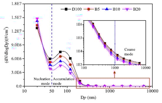 - Puzun, A.; Wanchen, S.; Guoliang, L.; Manzhi, T.; Chunjie, L.; Shibao, C. Characteristics of Particle Size Distributions About Emissions in A Common-rail Diesel Engine with Biodiesel Blends. Procedia Environ. Sci. 2011, 11, 1371–1378. [Google Scholar] [CrossRef][Green Version]