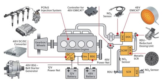 - Avolio, G.; Brück, R.; Maiwald, O.; Rösel, G.; Zhang, H. Super Clean Electrified Diesel: Towards Real NOx Emissions below 35 mg/km. In Proceedings of the 27th Aachen Colloquium Automobile and Engine Technology, Aachen, Germany, 8–10 October 2018. [Google Scholar]