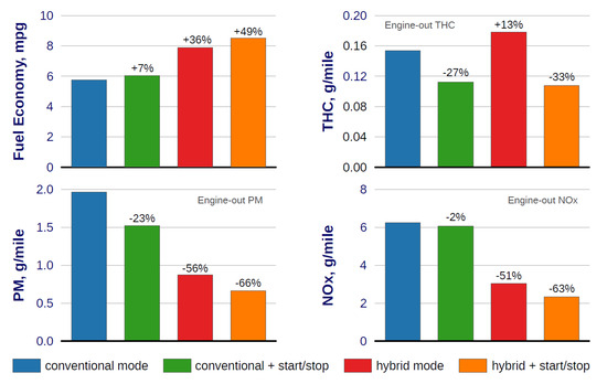 - Cook, A.; Deter, D.; Karnick, C.; Perry, N.; Thompson, B. Effects of Hybridization on Selective Catalytic Reduction (SCR) Thermal Management of a Medium Heavy-Duty Hybrid Work Truck. SAE Int. J. Engines 2021, 14, 507–516. [Google Scholar] [CrossRef]