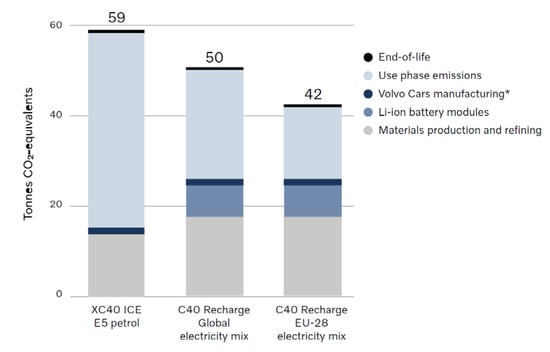 - Volvo. Carbon Footprint Report—Volvo C40 Report. 2021. Available online: https://www.volvocars.com (accessed on 3 April 2025).