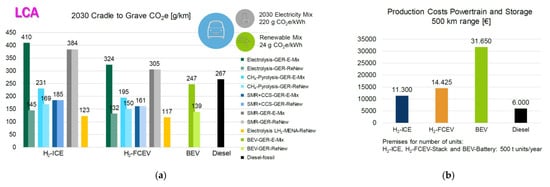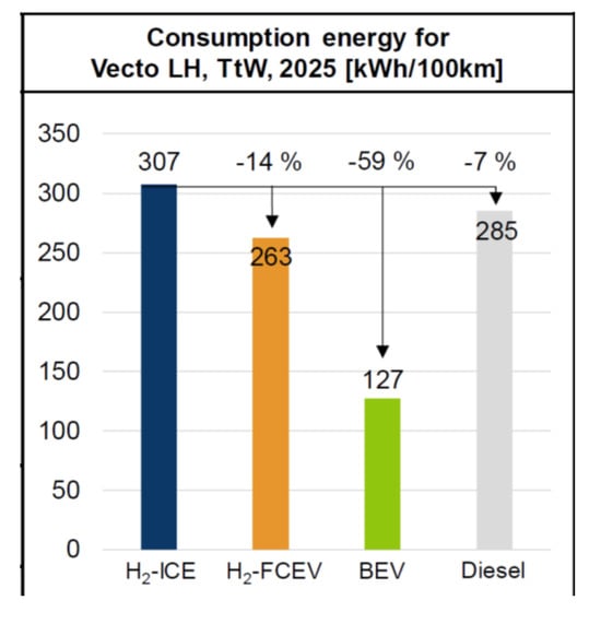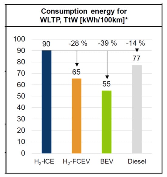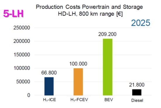 - Sens, M.; Danzer, C.; von Essen, C.; Brauer, M.; Wascheck, R.; Seebode, J.; Kratzsch, M. Hydrogen Powertrains in Competition to Fossil Fuel based Internal Combustion Engines and Battery Electric Powertrains. In Proceedings of the 42nd International Vienna Motor Symposium, Virtual, 29–30 April 2021; pp. 1–78. [Google Scholar]