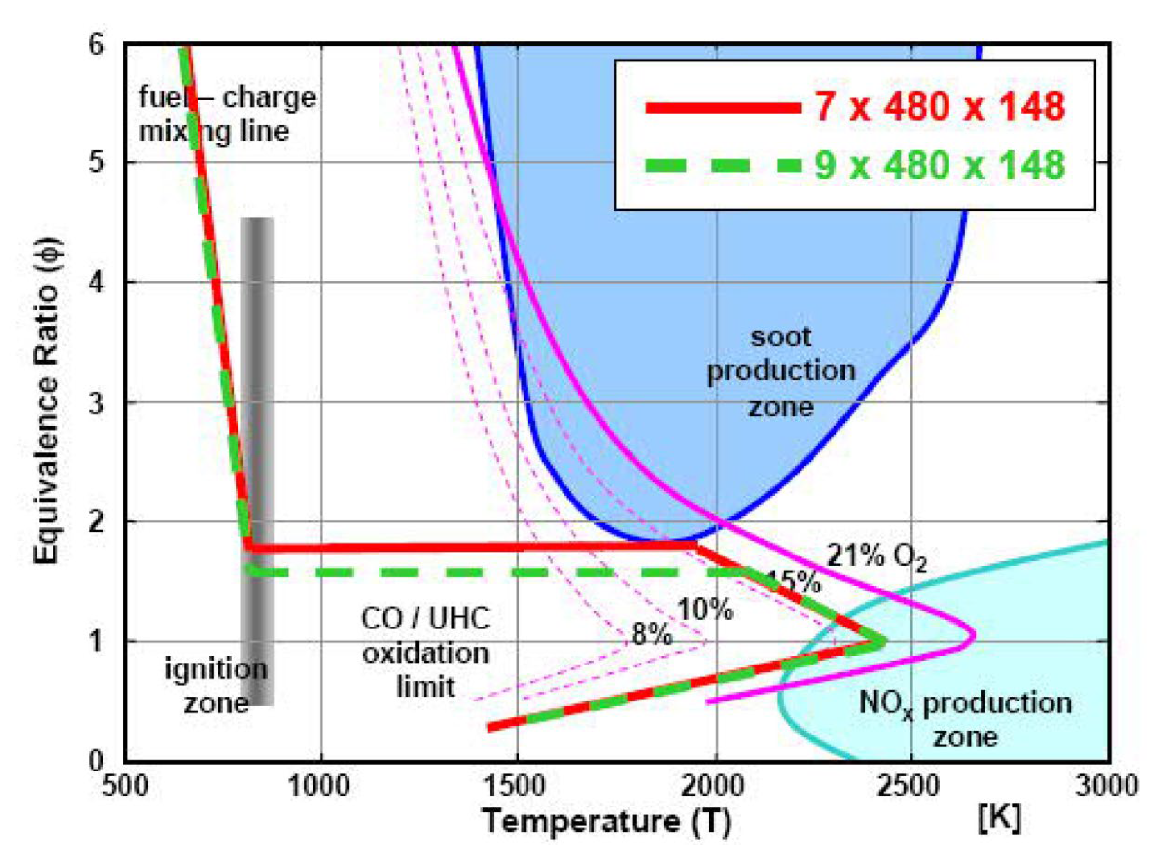 - spray characteristics influence the production of NOx emissions. In Dec’s conceptual model [346], there is a thin portion of the diffusion flame on the periphery of the fuel spray where φ ≈ 1, and the flame temperatures allow for NOx formation, which also continues in the hot post-combustion gas zone. Spray penetration, angle and area can therefore affect the NOx engine-out emissions significantly [330].