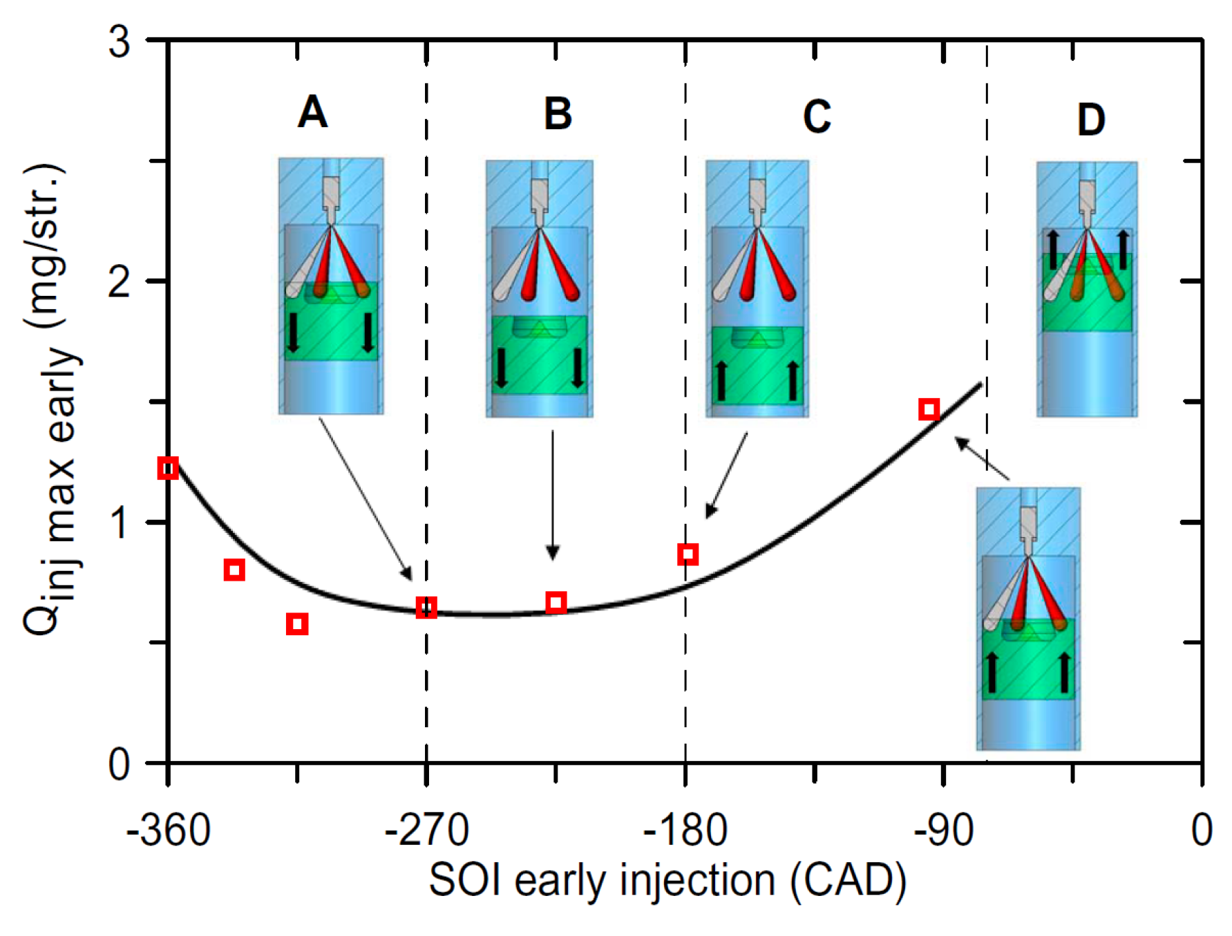 - Zone C: this zone corresponds to the beginning of the compression phase. When the SOI is delayed, Qinj max early also grows, due to the increase in ambient temperature and density inside the combustion chamber, while the available distance between the nozzle and the chamber walls does not change significantly;