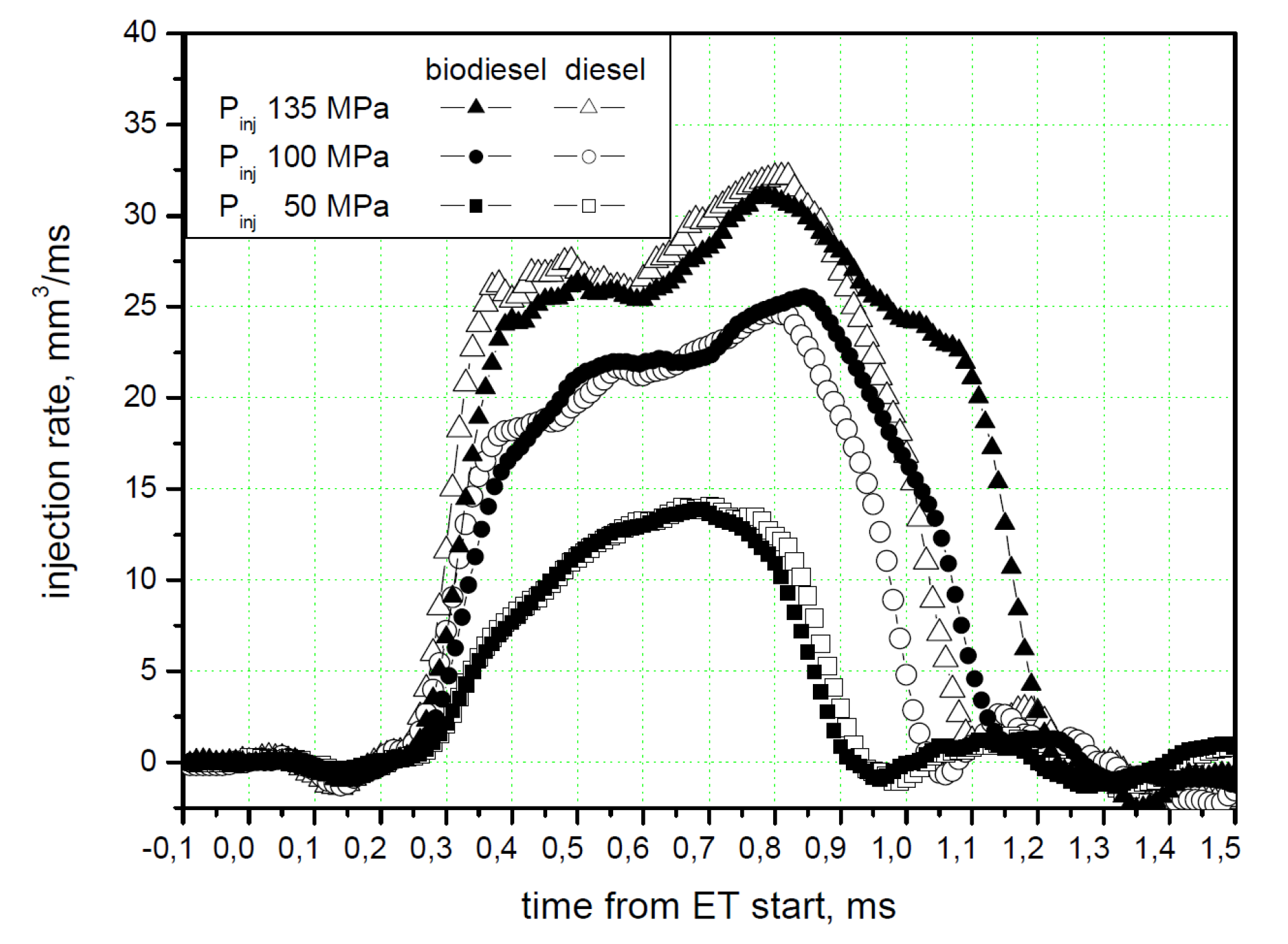 - the reduced fuel leakage, due to the higher kinematic viscosity of biodiesel, leads to higher injection pressures [307] and, hence, to higher injected mass for the pump–line–nozzle, distributor–pump and EUI systems;