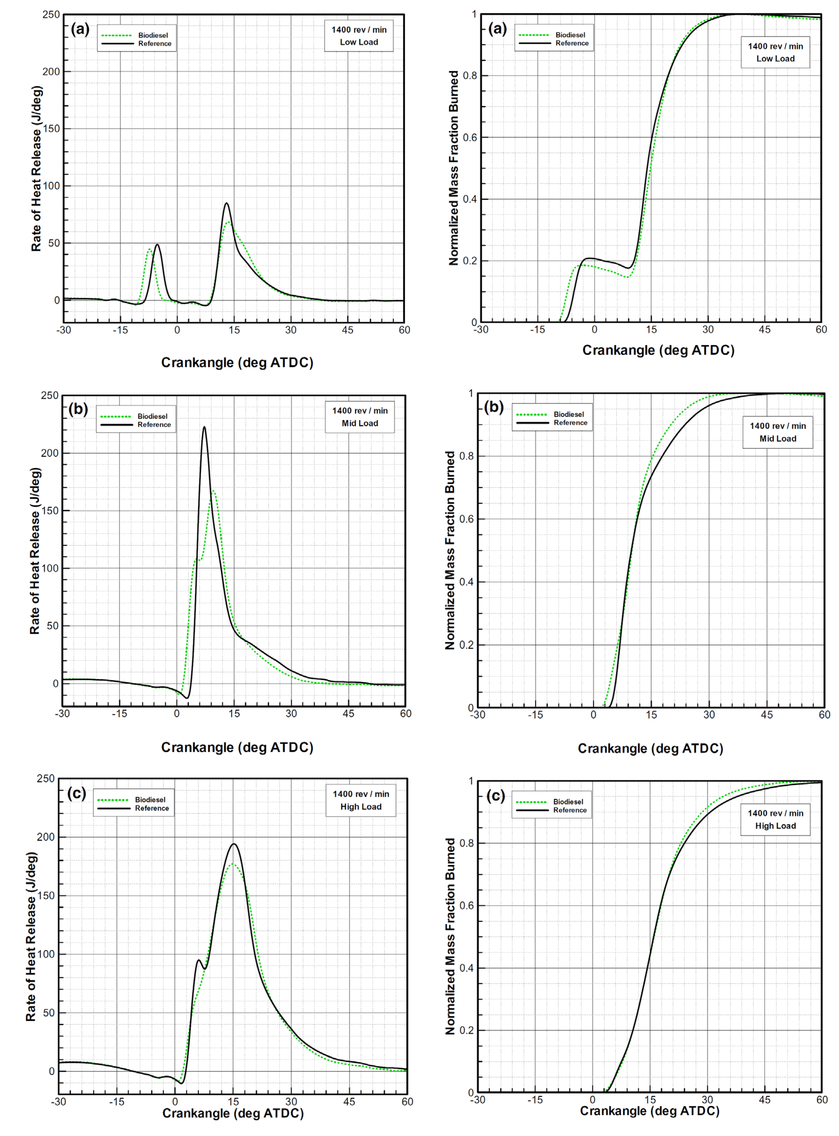 - in conventional combustion, the majority of heat at high load is released during the diffusive phase, resulting in high peak in-cylinder temperatures, which leads to relatively high NOx emissions: the fraction of diffusive combustion is usually higher for biodiesel. On the other hand, the higher cetane number of biodiesel in contrast to diesel may decrease NOx emissions under premixed combustion, which dominates at low loads. The lower biodiesel volatility, which makes the evaporation process slower with respect to that of diesel fuel, also contributes to the reduction in premixed combustion [315]. In short, higher magnitudes of HRR in the premixed phase cause higher in-cylinder temperatures and higher NOx for petrodiesel [293].