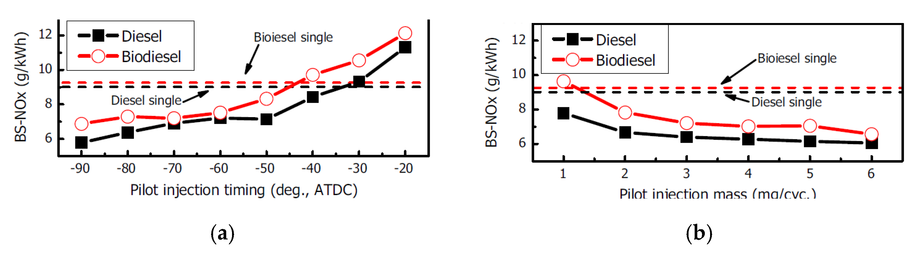 - the ECU can dictate an injection strategy with a longer injection pulse width based on the lower heating value per unit of volume of biodiesel, and this tends to advance the SOI of biodiesel. A lower EGR rate (the reduction can be up to 11%) is usually implemented, thus escalating in-cylinder temperatures and increasing NOx emissions. Furthermore, the engine calibration shift also affects the air-to-fuel ratio, the VGT position, the boost pressure, the injection pressure and the injection timing, and these changes can either reduce or increase the NOx emissions of biodiesel compared to biodiesel. However, the final total variation in NOx is usually not high (around 5% at low load and around 3–4% at high load);