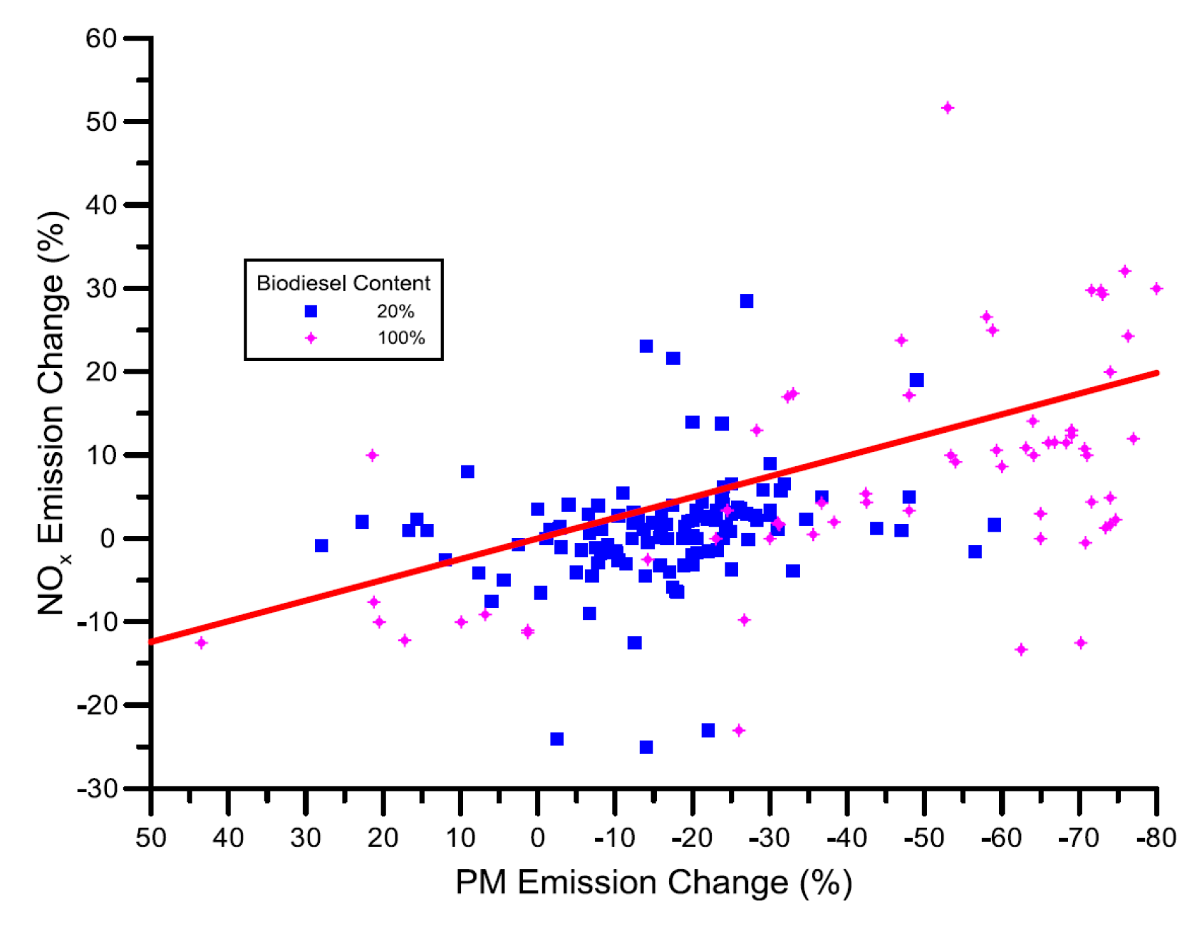 - the oxygen content in biodiesel allows more fuel to burn in the premixed phase, which results in higher local temperatures [328]. In fact, oxygen in the biodiesel results in a charge that is closer to stoichiometric (less rich) in the autoignition zone (more nitrogen can react with oxygen) [347]. Furthermore, at high loads, oxygen supports diffusive combustion. Each of these effects results in an increase in NOx. The NOx penalty due to oxygen presence in the fuel molecule exists for biodiesel even during load transients. The usual ECU strategy aims to shut down the EGR valve during load transients in order to help build up the air–fuel ratio and boost pressure and to limit intolerable smoke emissions. Whereas for diesel combustion, the relative air-to-fuel ratio equivalence ratio may be below unity (α < αst) during the turbocharger lag, for biodiesel, the excess of oxygen inherent in the blend leads to higher real values that are closer to stoichiometry and hence promote higher gas temperatures, thus increasing NOx for biodiesel;