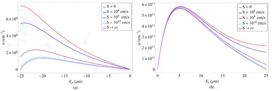 Effect of surface recombination rate on (a) electron and (b) hole carrier densities.